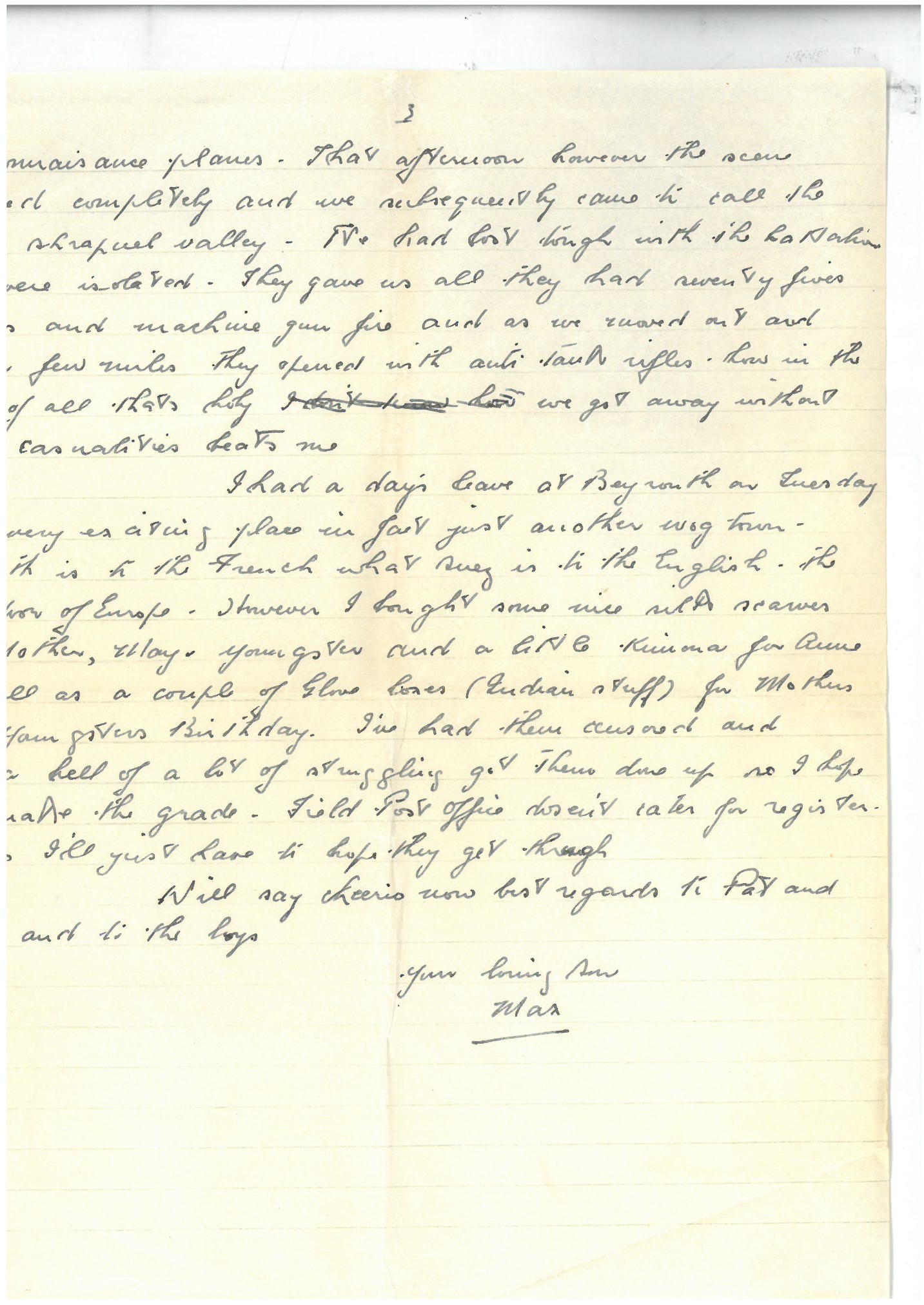 I had a day’s leave at Beyrouth(sic) on Tuesday. Not a very exciting place in fact just another wog town – Beyrouth is to the French what Suez is to the English – the back door to Europe. However I bought some nice silk scarves for Mother, May & Youngster and a little kimono for Anne as well as a couple of glove boxes (Indian stuff) for Mother’s and Youngster’s birthday. I’ve had them censored and after a hell of a lot of struggling got them done up so I hope they make the grade. Field Post Office doesn’t cater for registering, so I’ll just have to hope they get through.
