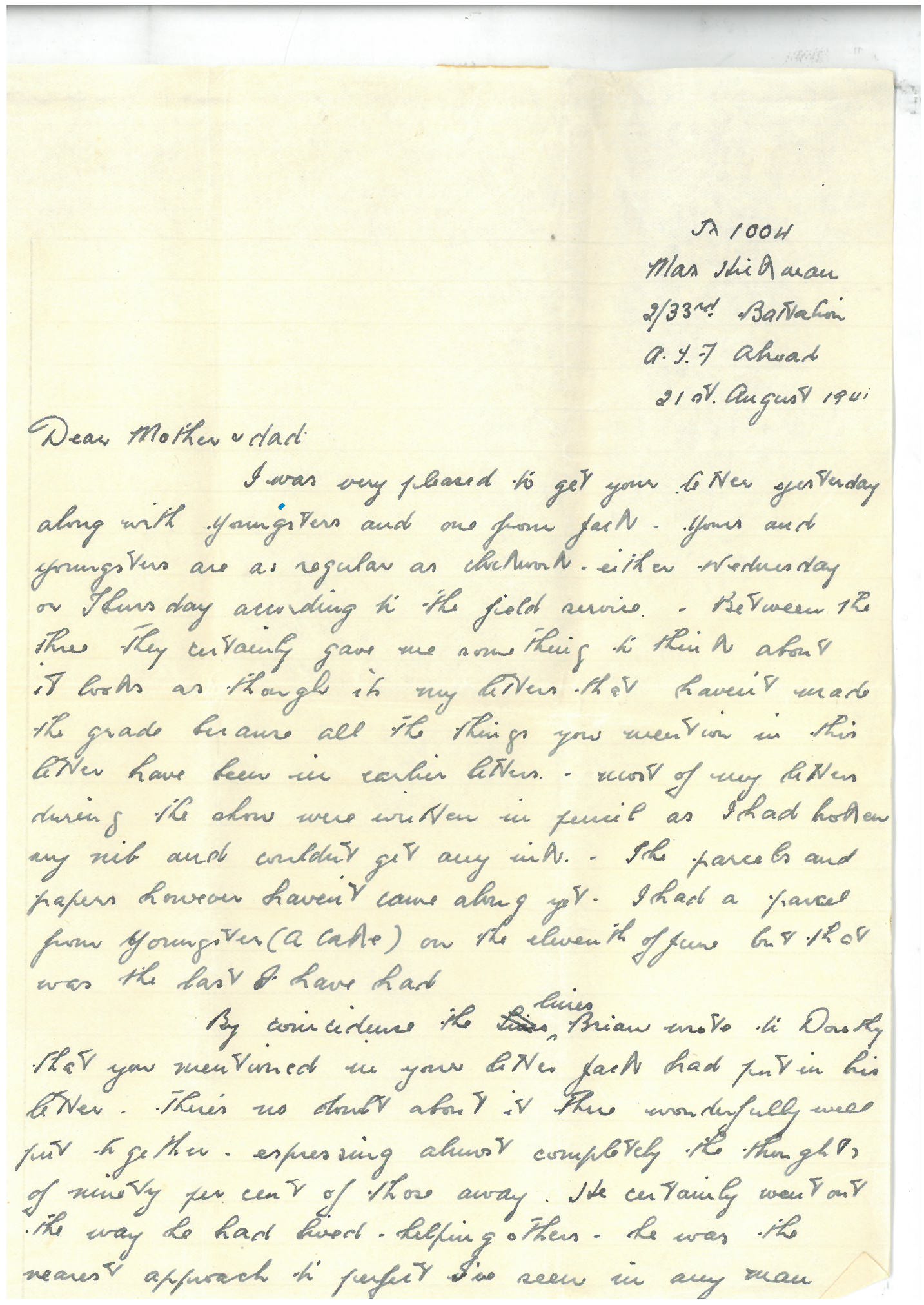 I was very pleased to get your letter yesterday along with Youngster’s and one from Jack. Yours and Youngster’s are as regular as clockwork – either Wednesday or Thursday according to the field service. Between the three they certainly gave me something to think about. It looks as though it’s my letters that haven’t made the grade because all the things you mention in this letter have been in earlier letters. Most of my letters during the show were written in pencil as I had broken my nib and couldn’t get any ink. The parcels and papers however haven’t come along yet. I had a parcel from youngster (a cake) on the eleventh of June but that was the last I have had.