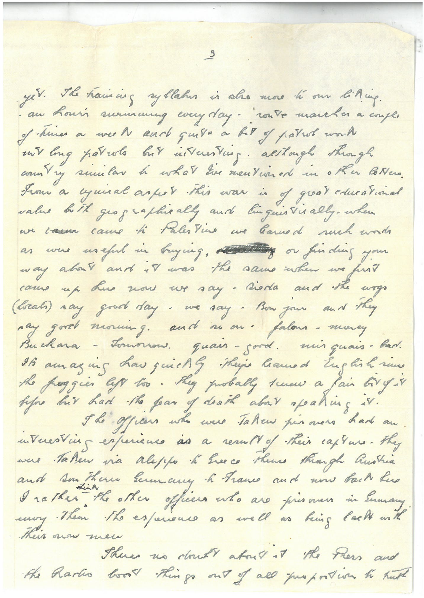 The officers who were taken prisoner had an interesting experience as a result of their capture. They were taken via Aleppo to Greece thence through Austria and southern Germany to France and now back here. I rather think the other officers who are prisoners in Germany envy them the experience as well as being back with their own men.