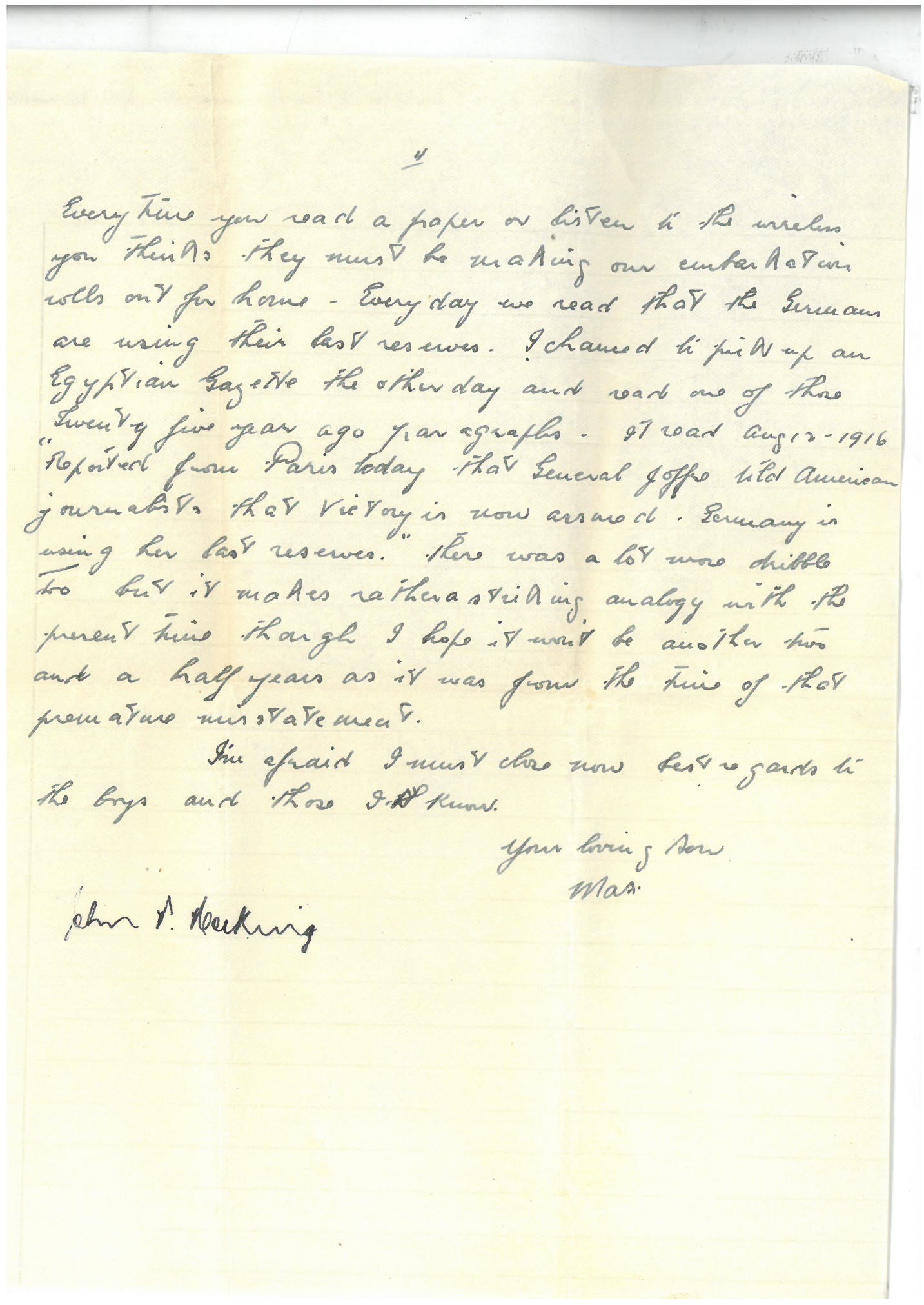 There’s no doubt about it the Press and the Radio boost things out of all proportion to truth. Every time you read a paper or listen to the wireless you think they must be making our embarkation rolls out for home. Every day we read that the Germans are using their last reserves. I chanced to pick up an Egyptian Gazette the other day and read one of these twenty five years ago paragraphs – It read Aug 12 1916 “Reported from Paris today that General Joffre told American journalists that Victory is now assured. Germany is using her last reserves”. There was a lot more dribble too but it makes rather a striking analogy with the present time though I hope it won’t be another two and a half years as it was from the time of that premature mis-statement.