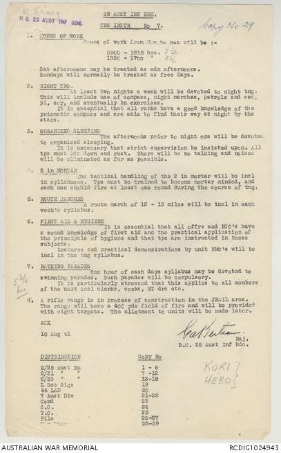 The 25th Australian Infantry Brigade’s Training Instruction no. 7, issued on 10 August gives more details about route marches, night training and bathing parades: