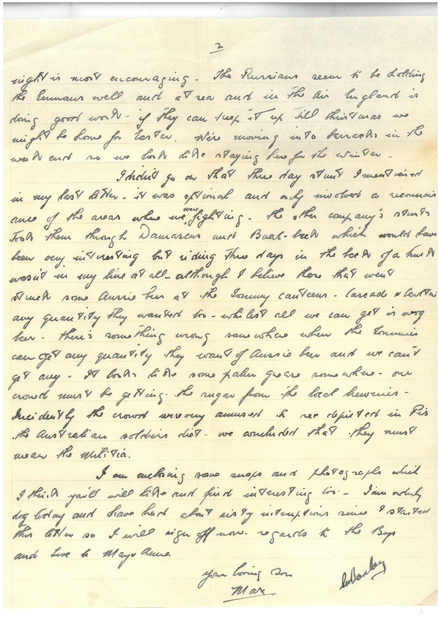I didn’t go on that three day stunt I mentioned in my last letter – it was optional and only involved a reconnaissance of the areas where we were fighting. The other company’s stunts took them through Damascus and Baal-bek which would have been very interesting but riding three days in the back of a truck wasn’t in my line at all – although I believe those that went struck some Aussie beer at the Tommy canteens – Cascade and Carlton – any quantity they wanted too – whilst all we can get is wog beer. There’s something wrong somewhere when the Tommies can get any quantity they want of Aussie beer and we can’t get any – It looks like some palm grease somewhere – our crowd must be getting the sugar from the local heavies. Incidentally the crowd were very amused to see depicted in Pix the Australian soldier’s diet – we concluded that they must mean the Militia.