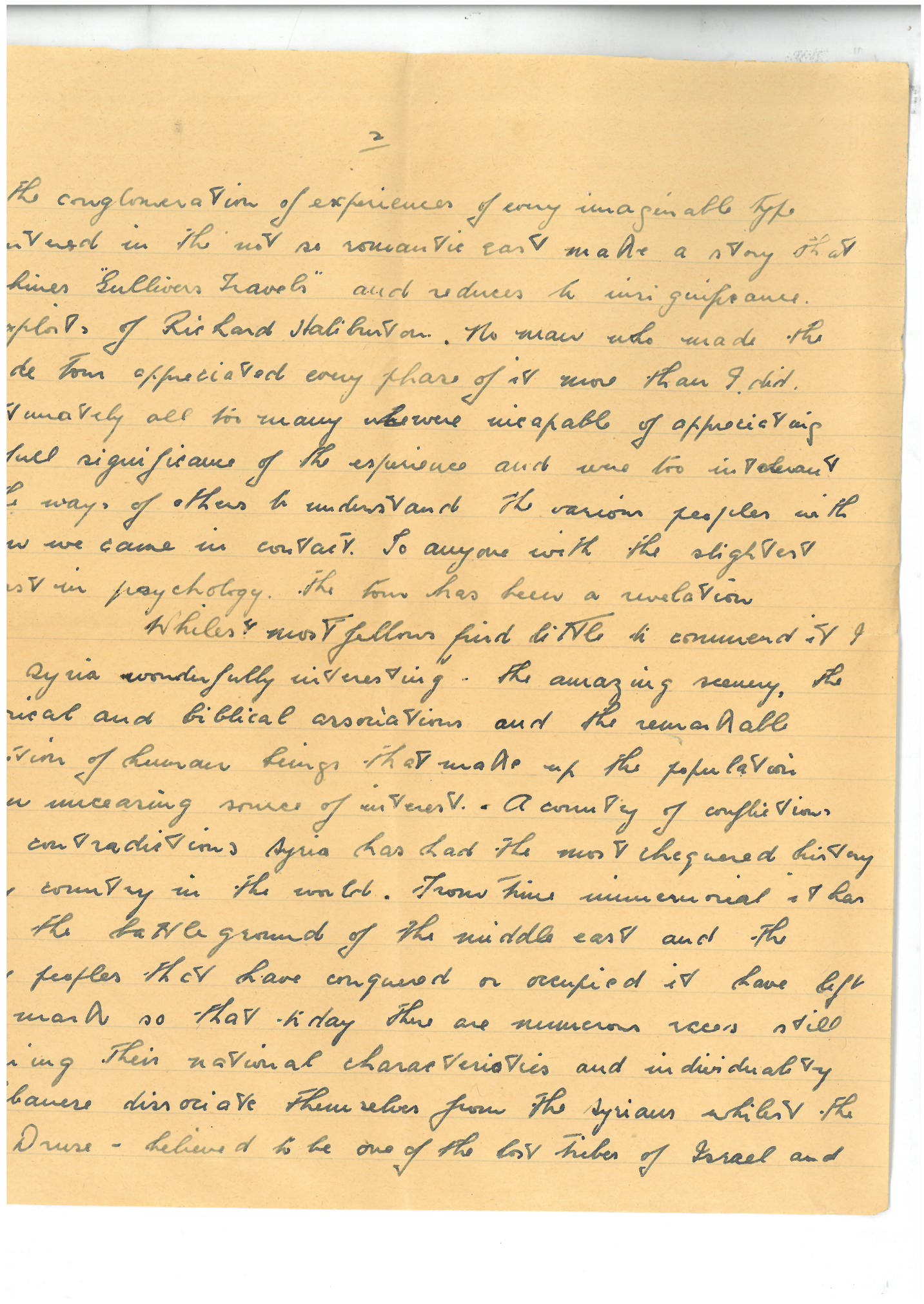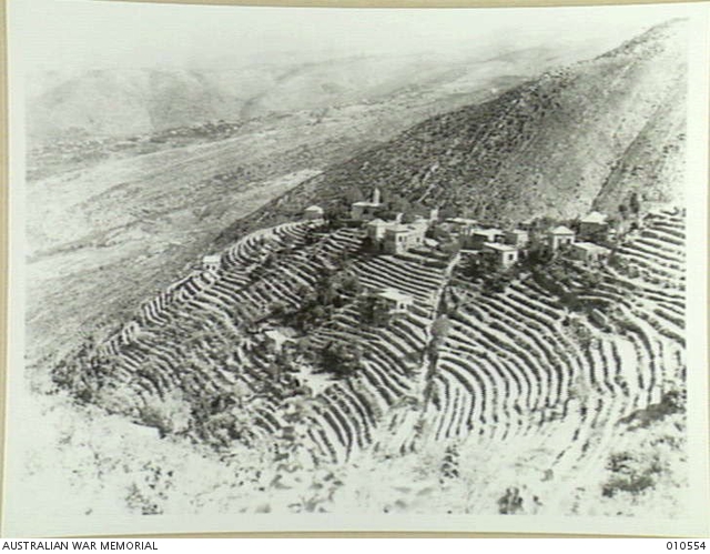 Whilest most fellows find little to commend it I find Syria wonderfully interesting – the amazing scenery, the historical and biblical associations and the remarkable collection of human beings that make up then population are an unceasing source of interest. A country of conflictions and contradictions, Syria has had the most chequered history of any country in the world. From time immemorial it has been the battleground of the middle wast and the many peoples that have conquered or occupied it have left their mark so that today there are numerous races still retaining their national characteristics and individuality. The Lebanese dissociate themselves froth Syrians whilst the Jebel Druse – believed to be one of the lost tribes of Israel and the original worshippers of the golden calf – dissociate themselves from both Syria and the Lebanon. Some of the mountain scenery is the best I’ve ever seen and I really think the best in the world. Around the Jezzine area where we were fighting the rugged mountains, some of them ten thousand feet high, made a picture of unbelievable grandeur. The terraced foothills and unbelievably crazy patterns made by the multicoloured rock formations were beyond the description of pen or paint.