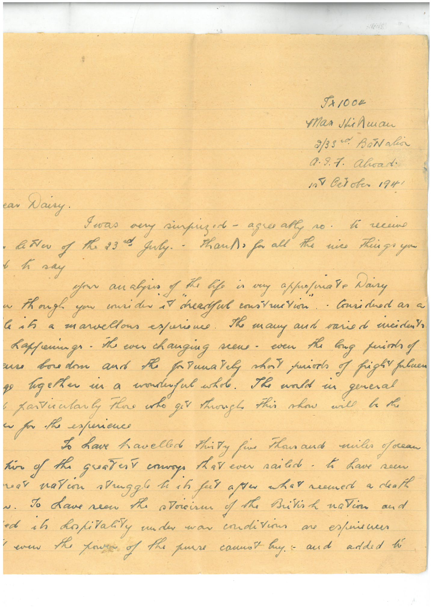 The other letters were very interesting too, covering as you may well imagine a wide field of ideas and news. I had quite given up expecting a letter from the Menzie’s. It’s so long since I heard from them – in fact nearly four months (1st June). The youngster’s letter and May’s were very newsy and Jack of course was his usual cheerful self.