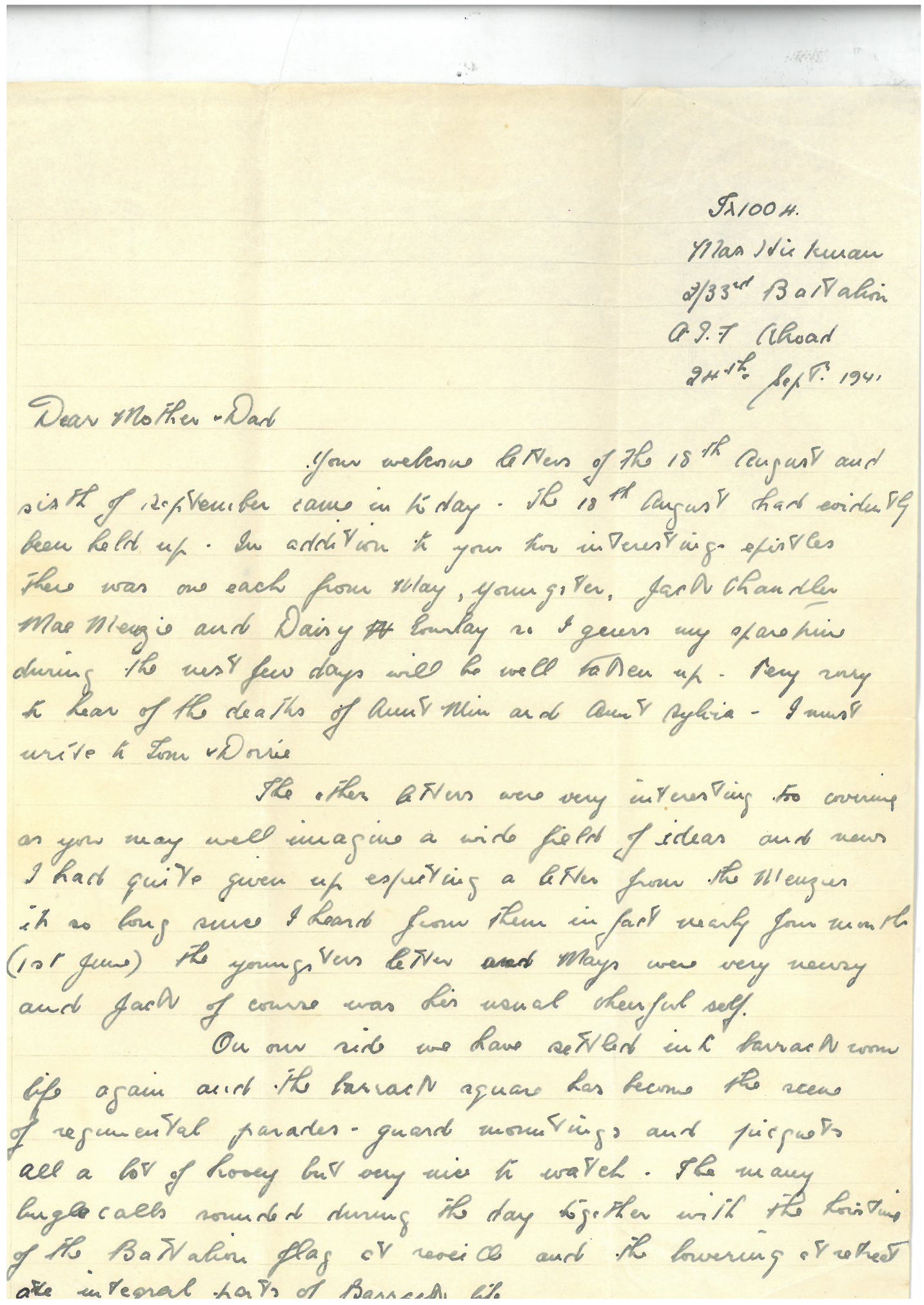Your welcome letters of the 18th August and sixth of September came in today. The 18th August had evidently been held up. In addition to your two interesting epistles there was one each from May, Youngster, Jack Chandler, Mae Menzie and Daisy Gourlay so I guess my spare time during the next few days will be well taken up. Very sorry to hear of the deaths of Aunt Min and Aunt Sylvia – I must write to Tom & Dorrie.