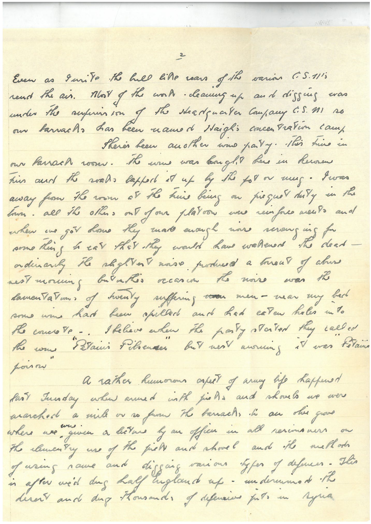 There’s been another wine party. This time in our barrack room. The wine was brought here in kerosene tins and the soaks lapped it up by the pot or mug. I was away from the room at the time, being on piquet duty in the town – others out of our platoon were reinforcements and when we got home they made enough noise scrounging for something to eat that they would have wakened the dead. Ordinarily the slightest noise produces a torrent of abuse next morning but on this occasion the noise was the lamentations of twenty suffering men. Near my bed some wine had been spilled and had eaten holes into the concrete. I believe when the party started they called the wine ‘Petain’s Pilsener’ but next morning it was ‘Petain’s poison’.