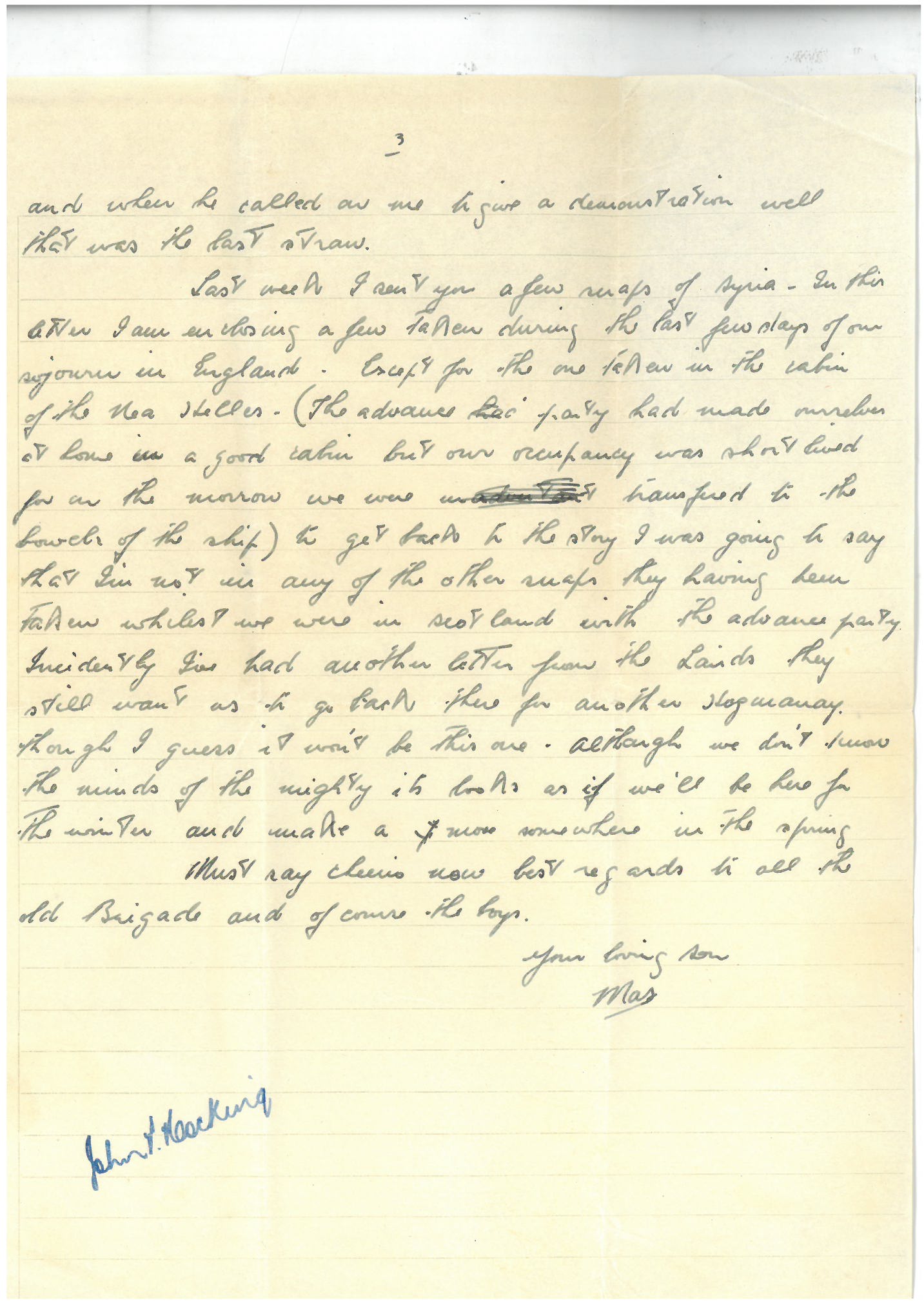 A rather humorous aspect of army life happened last Tuesday when armed with picks and shovels we were marched a mile or so from the barracks to an olive grove where we were given a lecture by an officer in all seriousness on the elementary use of the pick and shovel and the methods of using same and digging various types of defences. This is after we’d dug half of England up, undermined the desert and dug thousands of defensive pits in Syria – and when he called on me to give a demonstration well that was the last straw. Last week I sent you a few snaps of Syria. In this letter I am enclosing a few taken during the last few days of our sojourn in England. Except for the one taken in the cabin of the Nea Hellas (the advance party had made ourselves at home in a good cabin but our occupancy was short lived for on the morrow we were transferred to the bowels of the ship). To get back to the story – I was going to say that I’m not in any of the other snaps, they having been taken whilst we were in Scotland with the advance party. Incidentally I’ve had another letter from the Lairds – they still want us to go back there for another Hogmanay, though I guess it won’t be this one. Although we don’t know the minds of the mighty it looks as if we’ll be here for the winter and make a move somewhere in the spring.