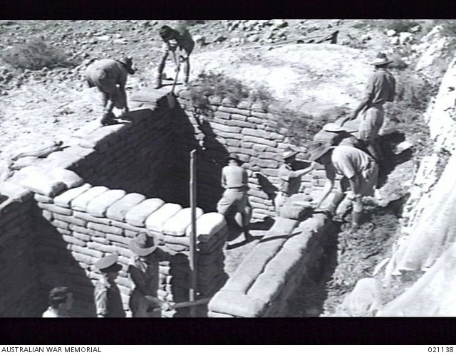 Men of the 2/31st Battalion at work on the field signal exchange excavations. The work was part of the second line of defence which ran from the coast at a point three miles south of the aerodrome almost due east to the Jebel Tourbel mountains.