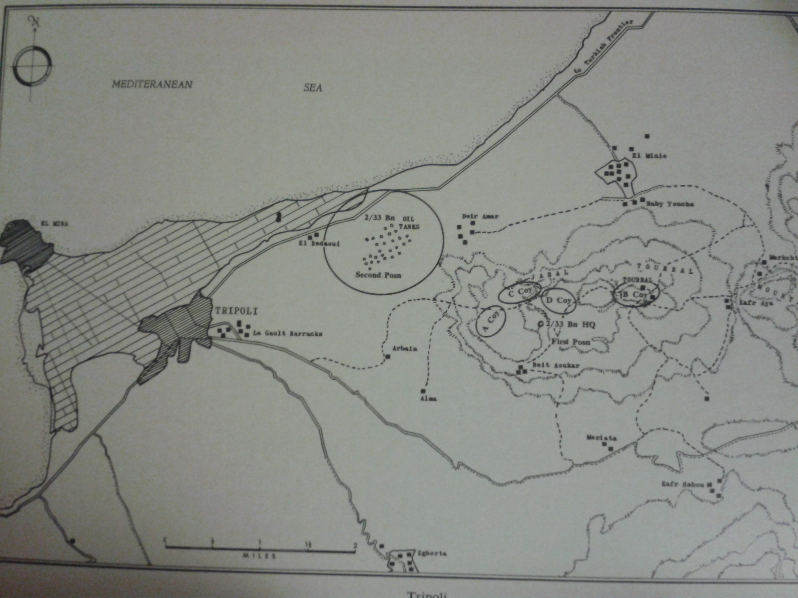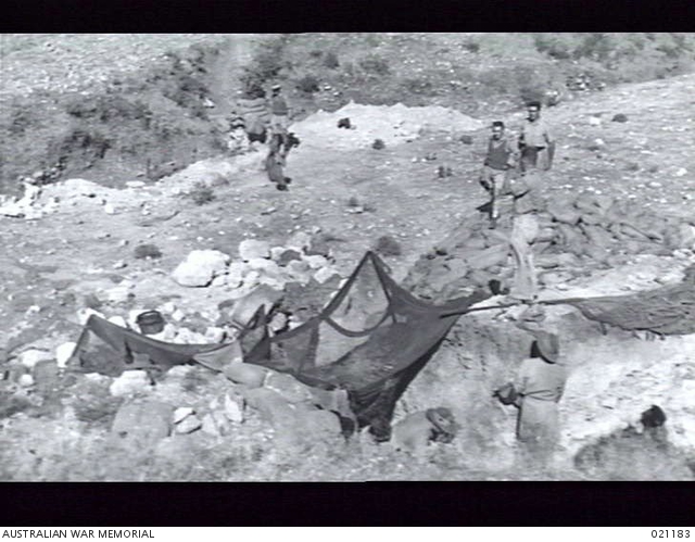 On 28 September, the battalion rifle companies were moved by vehicle…ten miles away in the mountains to the north-east. We debussed, marched and climbed from the road-head to a long plateau. Mules carried our tents and heavy stores up the two-mile climb. This was to be our part of the line that would defend the Port of Tripoli. Some 2000 feet above sea level, the escarpment looked down onto the flat lands that led away north to Latakia…..The battalion was the centre unit, with 2/25th on our left and 2/31st on our right….The battalion remained up in the hills until 21 October, and B company was to remain until 15 November. The life was pleasant and invigorating. Each of us would spend five days, each of ten hours, digging the trenches, section posts and HQ’s that were drawn out on the plan issued by Brigade. The sixth day was one of training, Sunday for ‘make, mend and rest’. At night the camp fires were going, and singing and story telling were popular pastimes……