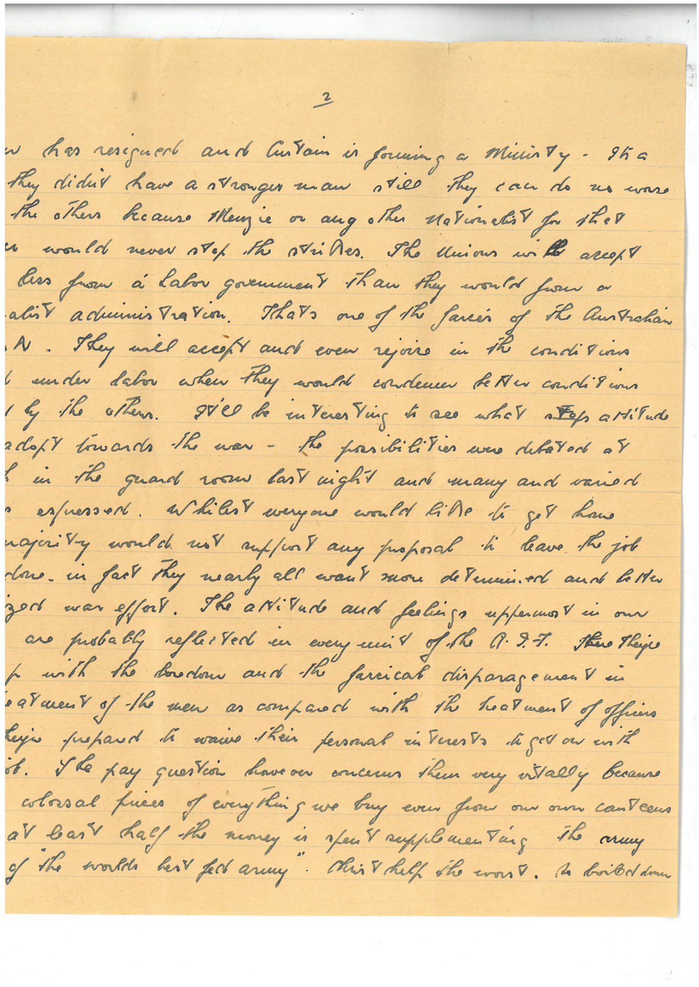 Just how true it is I don’t know but one of the chaps just came into the guard room with the news that Fadden has resigned and Curtin is forming a Ministry. It’s a pity they didn’t have a stronger man still they can do no worse than the others because Menzie or any other Nationalist for that matter would never stop the strikes. The Unions will accept a lot less from a Labor government than they would from a Nationalist administration. That’s one of the farces of the Australian outlook. They will accept and even rejoice in the conditions offered under Labor when they would condemn better conditions offered by the others. It’ll be interesting to see what attitude they adopt towards the war – the possibilities were debated at length in the guard room last night and many and varied opinions expressed. Whilest everyone would like to get home the majority would not support any proposal to leave the job half done – in fact they nearly all want more determined and better organised war effort. The attitude and feelings uppermost in our minds are probably reflected in every unit of the AIF. They’re fed up with the boredom and the farcical disparagement in the treatment of the men as compared with the treatment of officers but they’re prepared to waive their personal interests to get on with the job. The pay question however concerns them very vitally because of the colossal prices of everything we buy even from our own canteens and at least half the money is spent supplementing the army rations of ‘the world’s best fed army’. Christ help the worst. So boiled down our two concerns are supplies (equipment) and pay.
