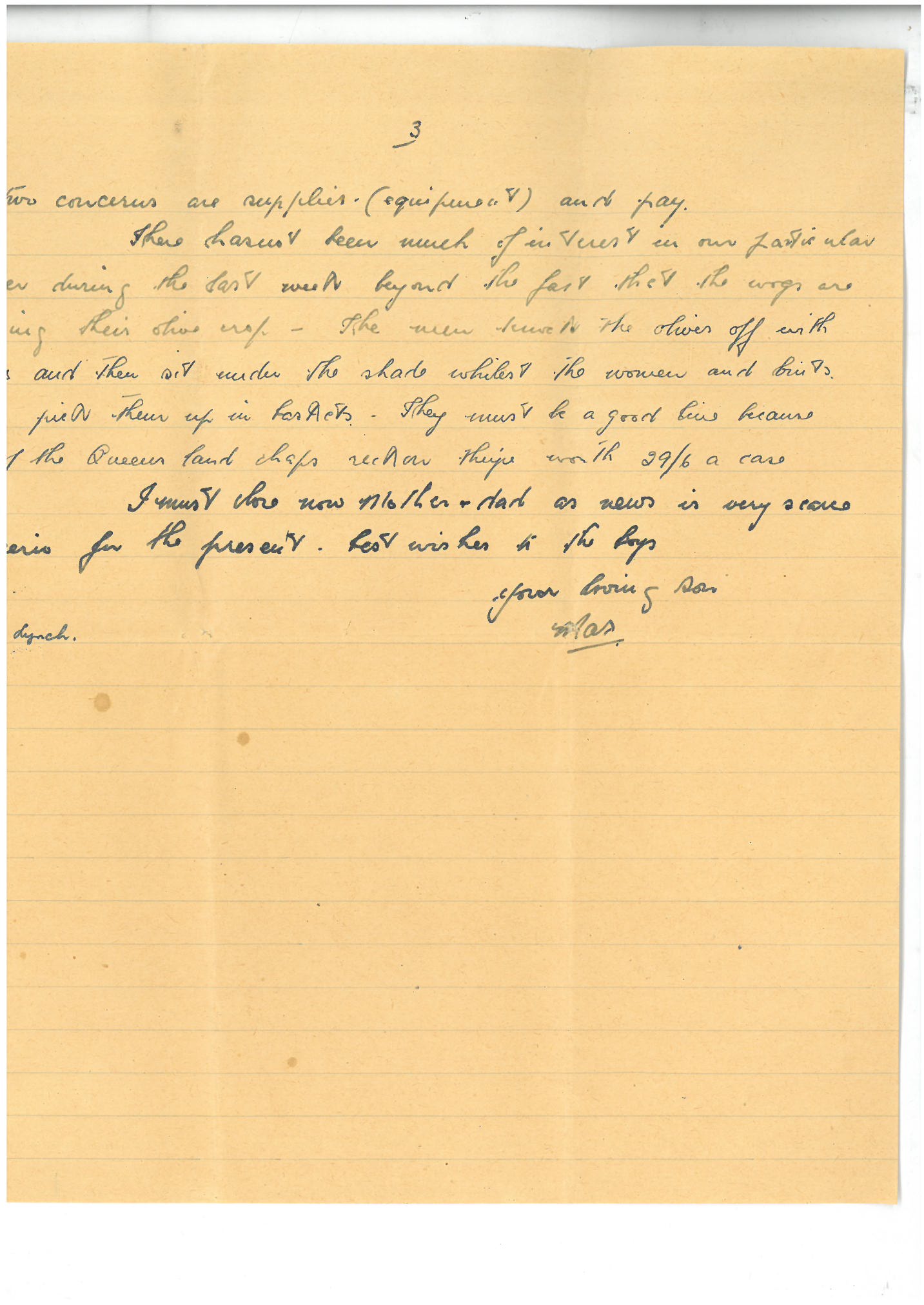 There hasn’t been much of interest in our particular quarter during the last week beyond the fact that the wogs are picking their olive crop. The men knock the olives off with sticks and then sit under the shade whilst the women and bints (girls) pick them up in baskets. They must be a good line because some of the Queensland chaps reckon they’re worth 29/6 a case.