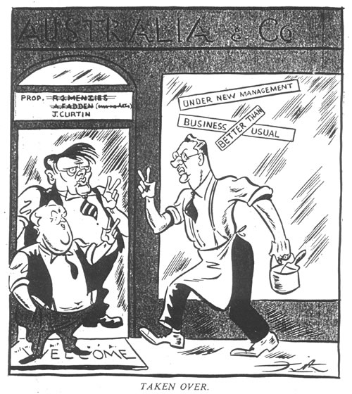 The cartoon ‘taken over’ appeared in The Bulletin on October 8, 1941. On this website, there is some information that helps in interpreting the cartoon: http://www.john.curtin.edu.au/aspirations/activities/2cartoonpm.html