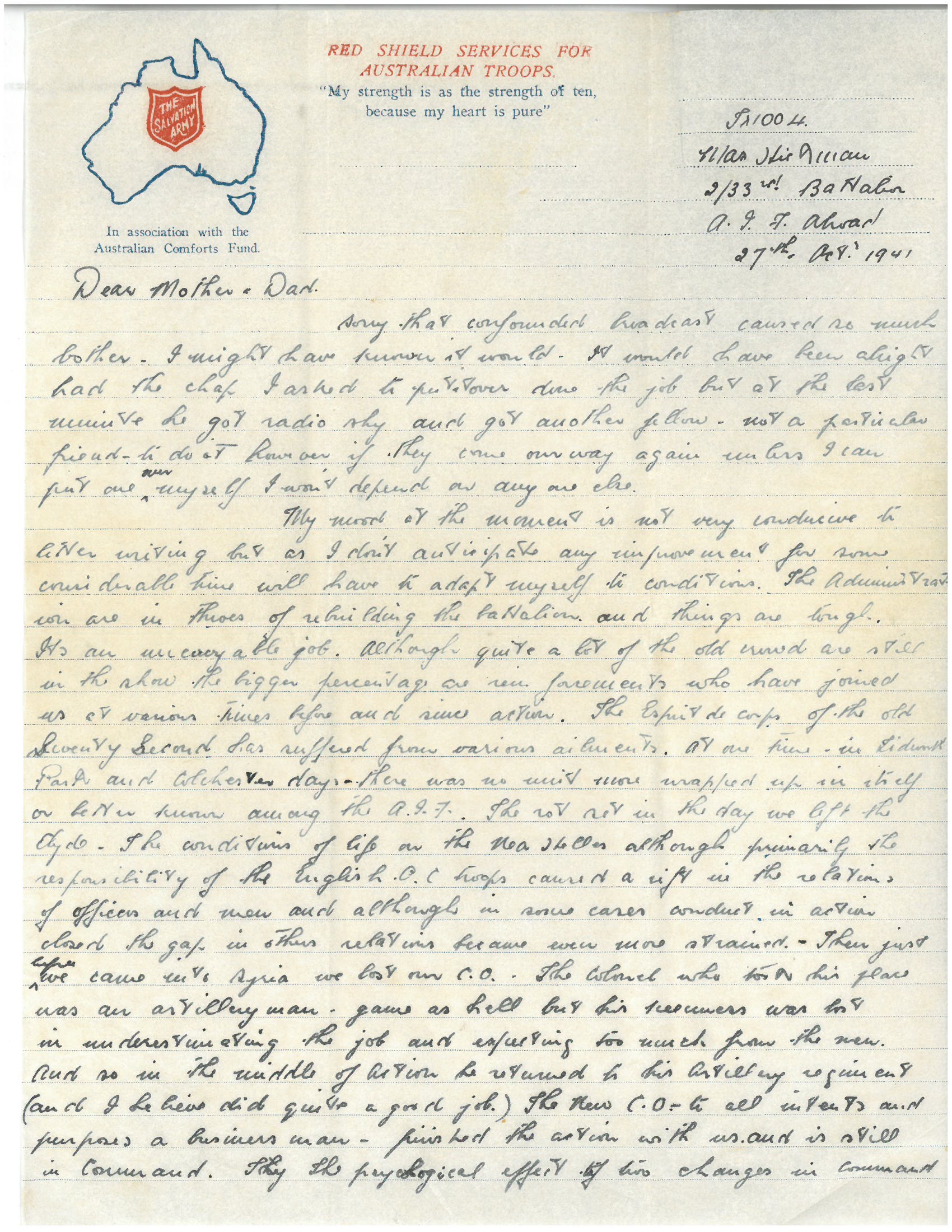 My mood at the moment is not very conducive to letter writing but as I don’t anticipate any improvement for some considerable time will have to adapt myself to conditions. The Administration are in the throes of rebuilding the battalion and things are tough. It’s an unenviable job. Although quite a lot of the old crowd are still in the show, the bigger percentage are reinforcements who have joined us at various times before and since action. The esprit de corps of the old Seventy Second has suffered from various ailments. At one time – in Tidworth Park and Colchester days – there was no unit more wrapped up in itself or better known among the AIF. The rot set in the day we left the Clyde. The conditions of life on the Nea Hellas although primarily the responsibility of the English O.C. troops caused a rift in the relations of officers and men and although in some cases conduct in action closed the gap, in others relations became even more strained. Then just before we came into Syria we lost our CO. The Colonel who took over his place was an artillery man – game as hell but his keenness was lost in underestimating the job and expecting too much from the men. And so in the middle of action he returned to his artillery regiment (and I believe did quite a good job). The new CO – to all intents and purposes a business man – finished the action with us and is still in command. The psychological effect of two changes in command in such short time had a bad reaction and today Corby has a tougher job than even Hamburger had in the memorable days when the 72nd had its beginnings. If he can awaken in the old crowd the spirit that animated – “we’re the seventy second and it’s fighting men are we” – and bring the re’oes into line he’ll be doing a great job. But in doing so he’ll have a hard row to hoe.