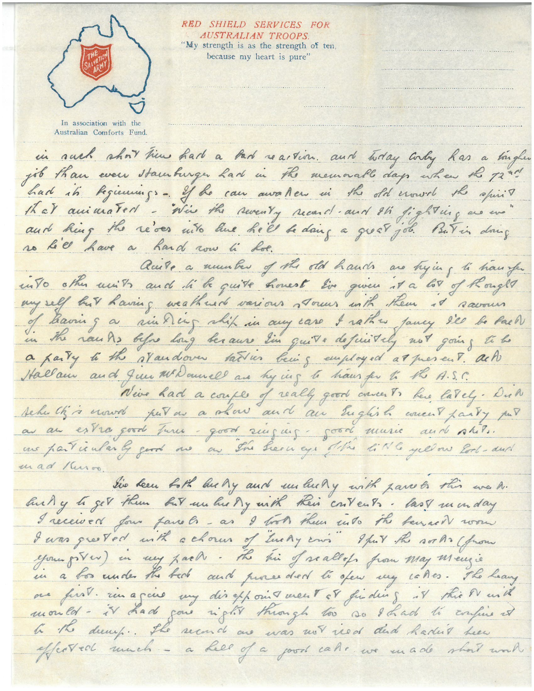 Quite a number of the old hands are trying to transfer into other units and to be quite honest I’ve given it a lot of thought myself but having weathered various storms with them it savours of leaving a sinking ship. In any case I rather think I’ll be back in the ranks before long because I’m quite definitely not going to be a party to the stand over tactics being employed at present. Ack Hallam and Jim McDonnell are trying to transfer to the ASC.