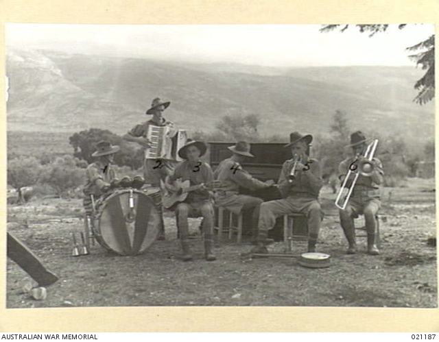 AWM 021187 : Jebel Tourbel, Syria 25/10/41 Members of the 2/31st Bn’s concert party. From left – VX11625 Private R G Buckley, VX16601 B G Coombe, QX20749 Private J Byford, NX11337 Private P Brown, SX5215 Corporal J Kirke and DX1246 Lieutenant L G Gardner