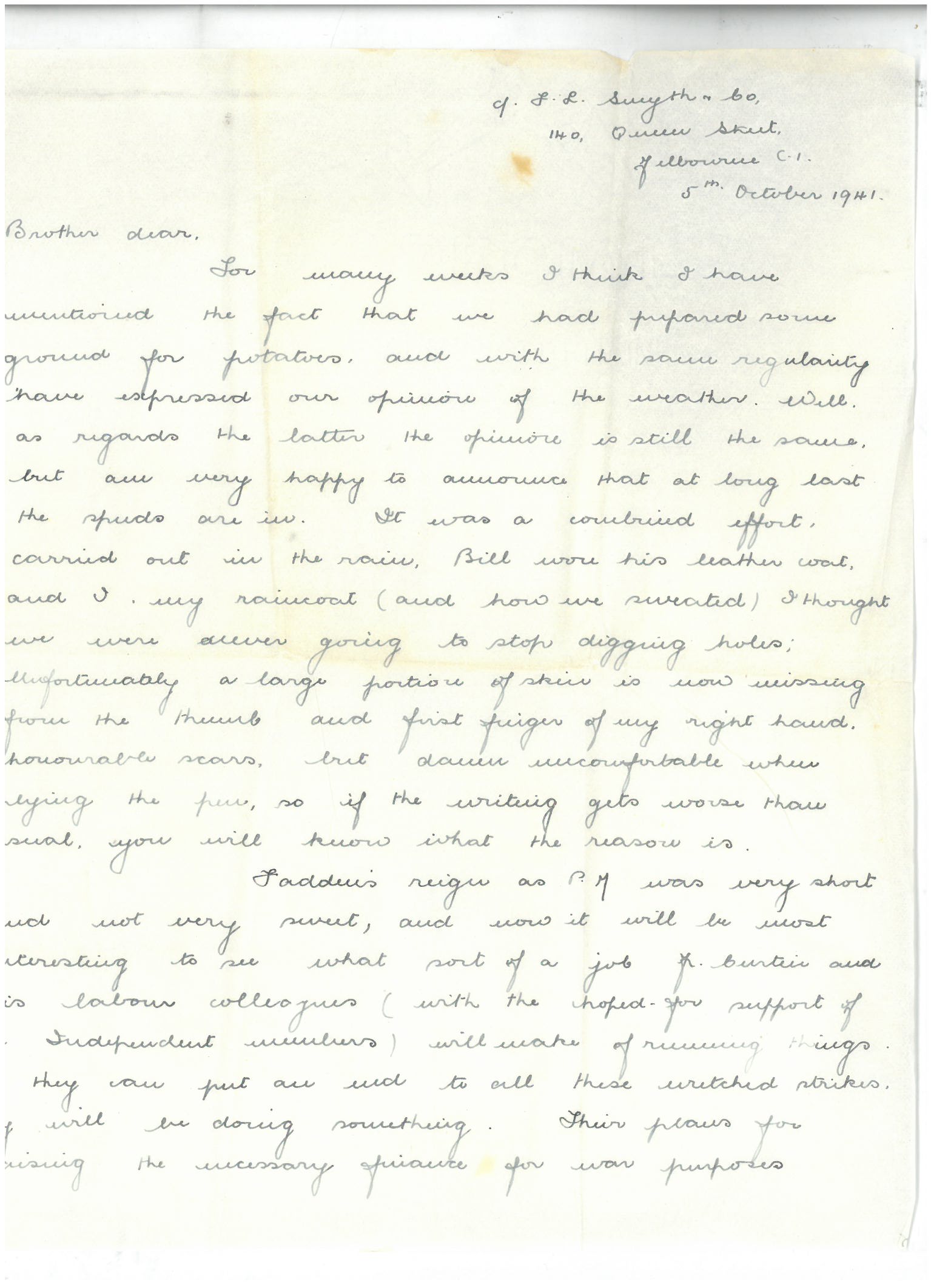 Fadden’s reign as PM was very short and not very sweet, and now it will be most interesting to see what sort of a job Mr Curtin and his Labor colleagues (with the hoped-for support of the Independent members) will make of running things. If they can put an end to all these wretched strikes they will be doing something. Their plans for raising the necessary finance for war purposes seem to consist of inflation mainly – not that they use that exact word. I think they term it ‘Drawing on the People’s Bank’. I would like to hear Henry’s comments on this change of Government, they would I think be rather forceful. You will probably receive a concise version of them Max.