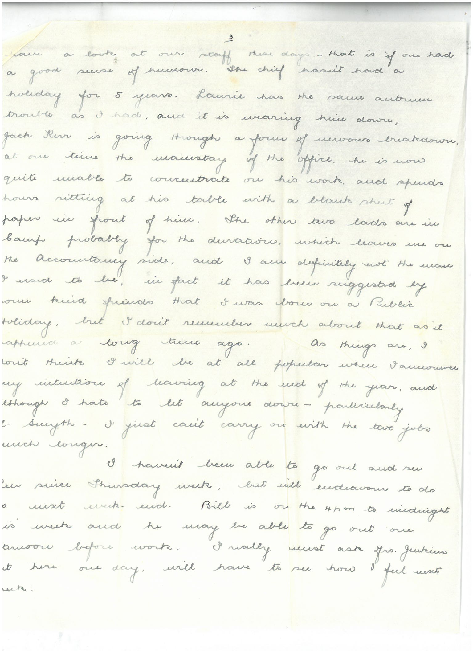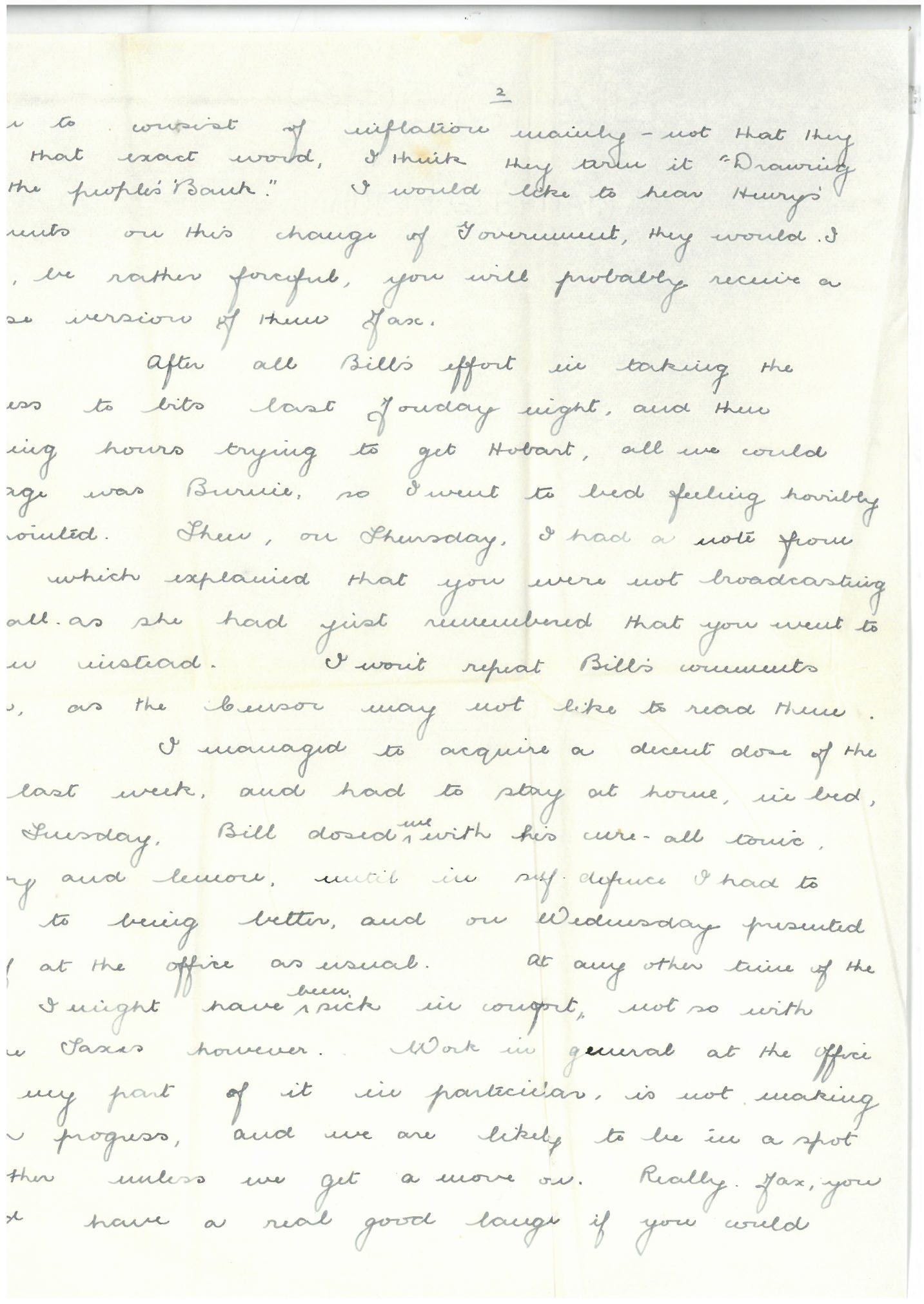 I managed to acquire a decent dose of the flu last week, and had to stay at home in bed last Tuesday. Bill dosed me with his cure-all tonic – whisky and lemon, until in self defence I had to admit to being better and on Wednesday presented myself at the office as usual. At any other time of the year I might have been sick in comfort, not so with Income Taxes however. Work in general at the office and my part of it in particular is not making much progress, and we are likely to be in a spot of bother unless we get a move on. Really Max, you would have a real good laugh if you could have a look at our staff these days – that is if one had a good sense of humour. The chief hasn’t had a holiday for 5 years. Laurie has the same altruism trouble as I had, and it is wearing him down. Jack Kerr is going through a form of nervous breakdown – at one time the mainstay of the office, he is now quite unable to concentrate on his work, and spends hours sitting at his table with a blank sheet of paper in front of him. The other two lads are in Camp and probably for the duration, which leaves me on the Accountancy side, and I am definitely not the man I used to be. In fact it has been suggested by some kind friends that I was born on a public holiday – but I don’t remember much about that as it happened a long time ago. As things are, I don’t think I will be at all popular when I announce my intention of leaving at the end of the year, and although I hate to let anyone down – particularly Mr Smythe – I just can’t carry on with the two jobs much longer.