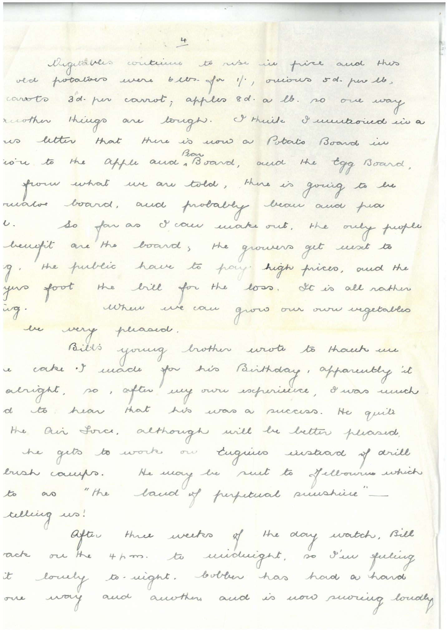 Vegetables continue to rise in price and this week old potatoes were 6lbs for 1/-, onions 5d per lb, and carrots 3d per carrot, apples 8d a lb so one way and another things are tough. I think I mentioned in a previous letter that there is now a Potato Board in addition to the Apple and Pear Board, and the Egg Board. Now, from what we are told, there is going to be a tomato board, and probably bean and pea board. So far as I can make out, the only people who benefit are the Board, the growers get next to nothing. The public have to pay high prices and the taxpayers foot the bill for the loss. It is all rather amazing. When we can grow our own vegetables I will be very pleased.