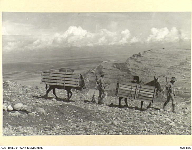 AWM 021186: Jebel Tourbel topography : the nature of the terrain meant that donkeys were often the best means of transporting goods. No wonder they brought in the carriers to help with road building!