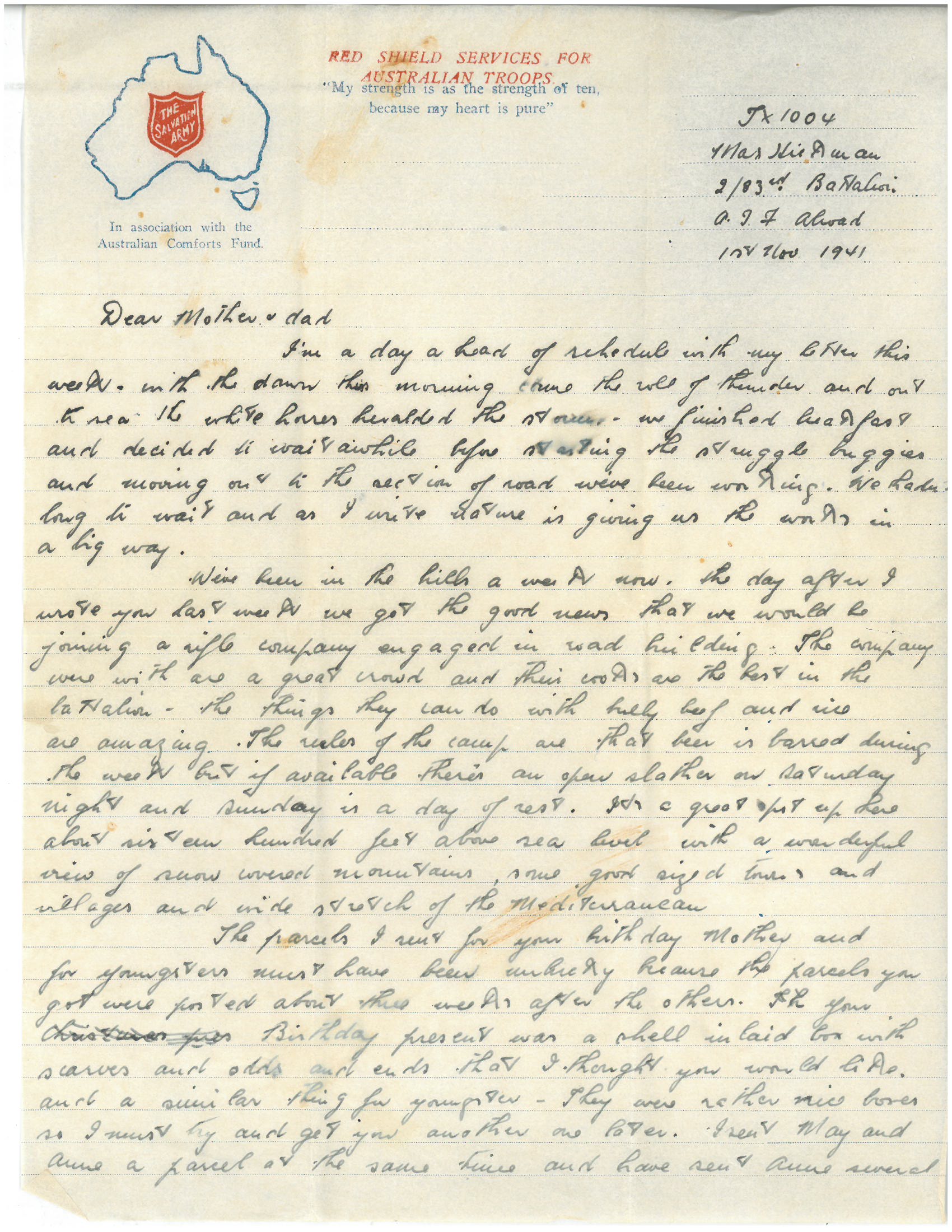 We’ve been in the hills a week now. The day after I wrote you last week we got the good news that we would be joining a rifle company engaged in road building. The company we’re with are a great crowd and their cooks are the best in the battalion. The things they can do with bully beef and rice are amazing. The rules of the camp are that beer is barred during the week but if available there’s an open slather on Saturday night and Sunday is a day of rest. It’s a great spot up here about sixteen hundred feet above sea level with a wonderful view of snow covered mountains, some good sized towns and villages and the wide stretch of the Mediterranean.