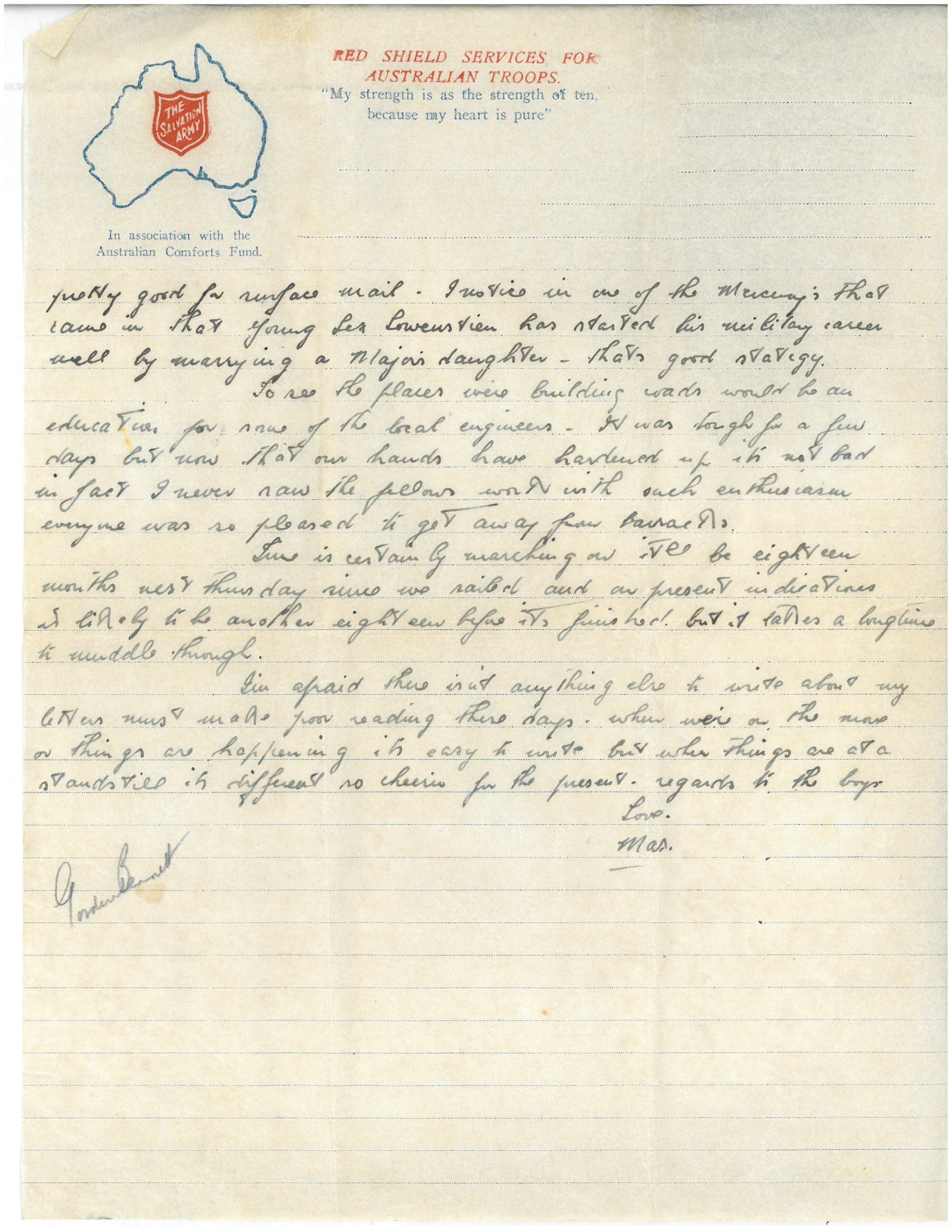 The papers you and Youngster are sending are arriving regularly. I got a Bulletin 10th September the other day so that’s pretty good for surface mail – I notice in one of the Mercury’s that came in that young Les Lowenstein has started his military career well by marrying a Major’s daughter – that’s good strategy.
