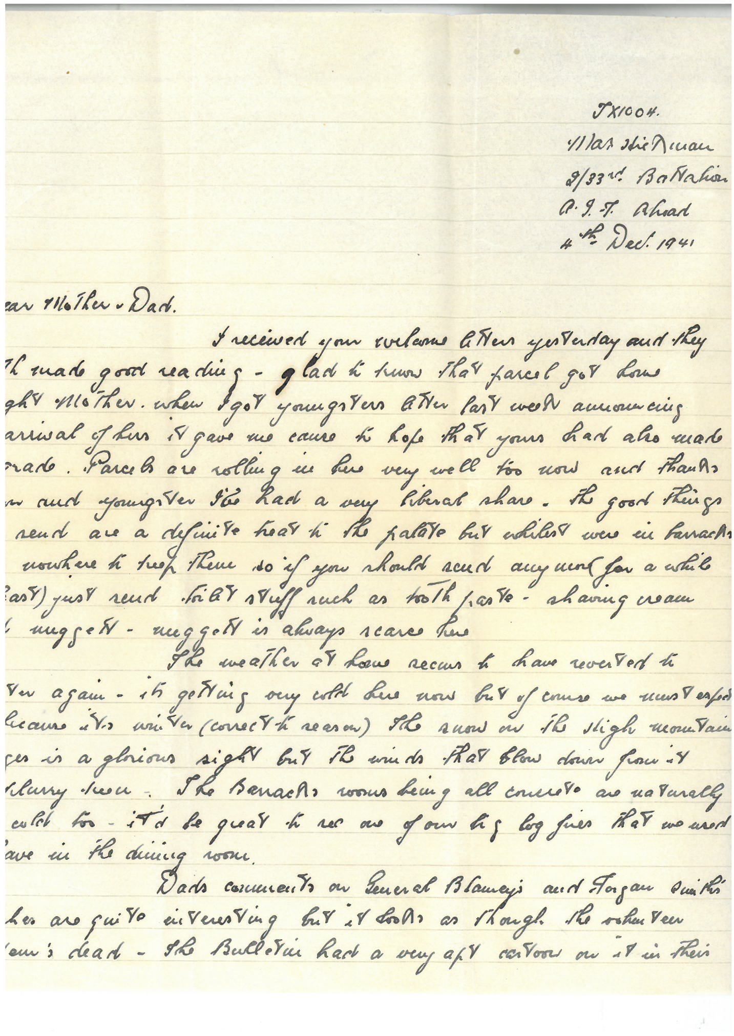 I received your welcome letters yesterday and they both made good reading – glad to know that parcel got home alright Mother. When I got Youngster’s letter last week announcing the arrival of hers, it gave me cause to hope that yours had also made the grade. Parcels are rolling in here very well too now and thanks to you and Youngster I’ve had a very liberal share. The good things you send are a definite treat to the palate but whilst we’re in barracks we’ve nowhere to keep them so if you should send any more (for a while at least) just send toilet stuff such as toothpaste, shaving cream and nugget – nugget is always scarce here.