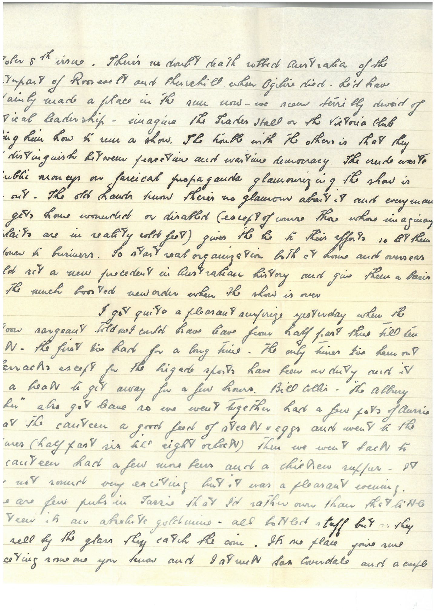Dad’s comments on General Blamey’s and Jorgan(?) Smith’s speeches are quite interesting but it looks as though the volunteer system’s dead. The Bulletin had a very apt cartoon on it in their October 8th issue. There’s no doubt death robbed Australia of the counterpart of Roosevelt and Churchill when Ogilvie died. He’d have certainly made a place in the sun (but) now – we seem terribly devoid of political leadership. Imagine the Trades Hall or the Victoria Club telling him how to run a show. The trouble with the others is that they can’t distinguish between peacetime and wartime democracy. The crude waste of public moneys on farcical propaganda glamourising the show is worn out. The old hands know there’s no glamour about it and every man who gets home wounded or disabled (except of course those whose imaginary complaints are in reality cold feet) gives the lie to their efforts so let them get down to business. To start real organisation both at home and overseas would set a new precedent in Australian history and give them a basis for the much boosted new order when the show is over.