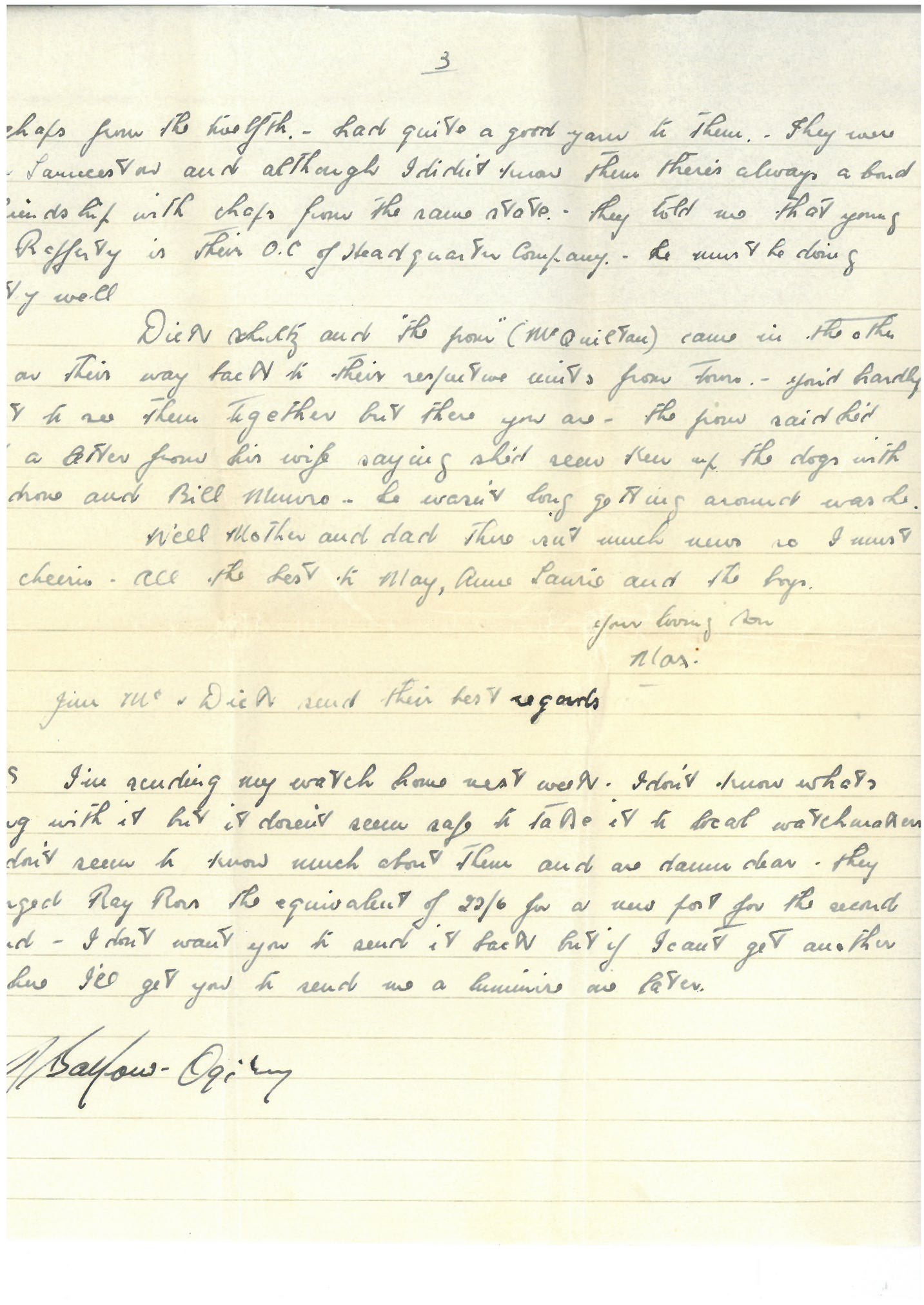 Well mother and dad there isn’t much news so I must say cheerio – All the best to May, Anne, Laurie and the boys.