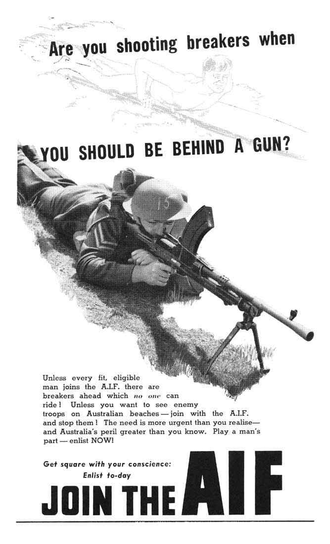 The only ‘propaganda’ I can find (apart from carefully managed newspaper reports of the various campaigns) are the posters encouraging people to grow their own food, contribute to the War Loans, support those working in munitions factories, join the Women’s Land Army or enlist in the AIF – such as this one: