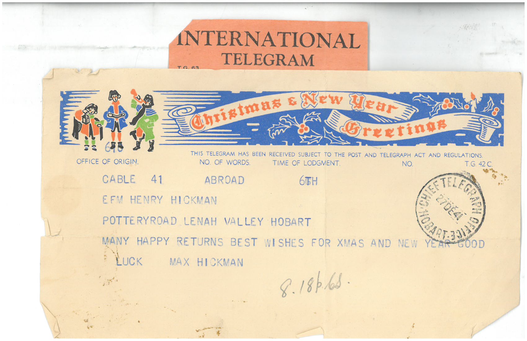 From 1906 to 1959 each of Tasmania’s five electorates returned 6 members to the House of Assembly. Prior to the 1941 election, Labor with Premier Robert Cosgrove held 18 seats and the Nationalists 12. As a result of the election, Labor’s majority increased : as mentioned in the letter, each electorate returned 4 Labor and 2 national representatives, giving a total of 20 Labor 10 Nationalist. Henry Hope was indeed lucky to be elected, when other candidates’ preferences were distributed.