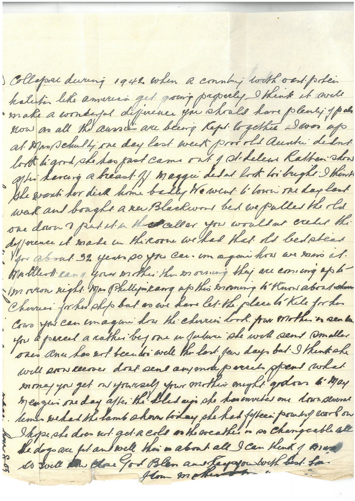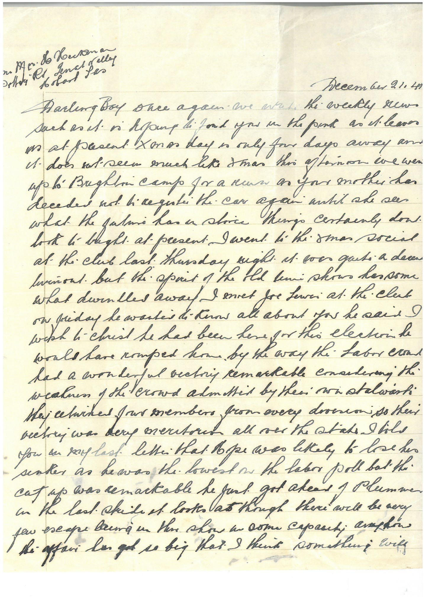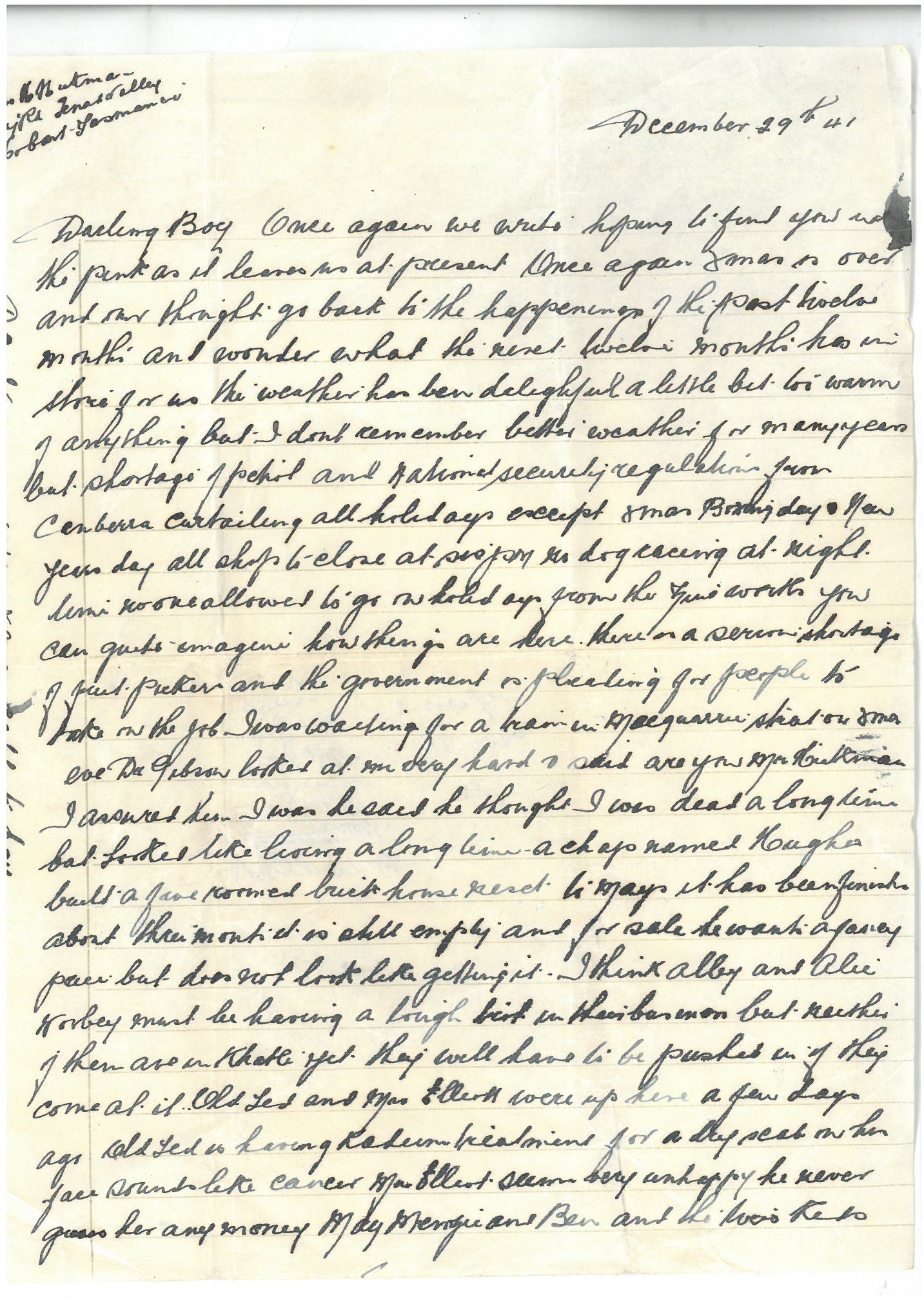 Darling Boy. Once again we write the weekly news such as it is hoping to find you in the pink as it leaves us at present. Xmas Day is only four days away and it does not seem much like Xmas. This afternoon we went up to Brighton Camp for a run as your mother has decided not to register the car again until she sees what the …. has in store. Things certainly don’t look too bright at present. I went to the Xmas social at the club last Thursday night. It was quite a decent turnout but the spirit of the old time shows has somewhat dwindled away. I met Joe Lewis at the club on Friday. He wanted to know all about you. He said “I wish to Christ he had been here for this election: he would have romped home.” By the way, the Labor crowd had a wonderful victory – remarkable considering the weakness of the crowd, admitted by their own stalwarts. They returned four members from every division so their victory was very meritorious (?) all over the state. I told you in my last letter that Hope was likely to lose his sinker (seat?) as he was the lowest on the Labor roll but the cut up was remarkable. He just got ahead of Plummer in the last stride. It looks as though there will be very few escape being in the show in some capacity. Anyhow the affair has got so big that I think something will collapse during 1942 when a country with vast potentiality(?) like America gets going properly I think it will make a wonderful difference. You should have plenty of pals now as all the Aussies are being kept together. I was up at Mrs Schultz one day last week. Poor old Auntie didn’t look too good. She has just come out of St Helens. Rather slow after having a breast off. Maggie didn’t look too bright. I think she wants her Dick home badly. We went to town one day last week and bought a new blackwood bed. We pulled the old one down & put it in the cellar. You wouldn’t credit the difference it made in the room. We had that bedstead for about 32 years so you can imagine how we miss it. Mr Elliott rang your mother this morning. They are coming up tomorrow night. Mrs Phillips rang up this morning to know about cherries for her shop but as we have let the place to Kile for his cows you can imagine how the cherries look. Your mother is sending you a parcel – a rather big one. In future she will send smaller ones. Anne has not been too well the last few days but I think she will soon recover. Don’t send any more parcels. Spend what money you get on yourself. You mother might go down to Mae Menzie’s one day after the holidays. She has invited me down several times . We had the lamb shorn today. She had fifteen pounds of wool on. I hope she does not get a cold as the weather is so changeable . The dogs are fit and well. That’s about all I can think of Max so will now close. God bless and keep you with best love from Mother & Dad.