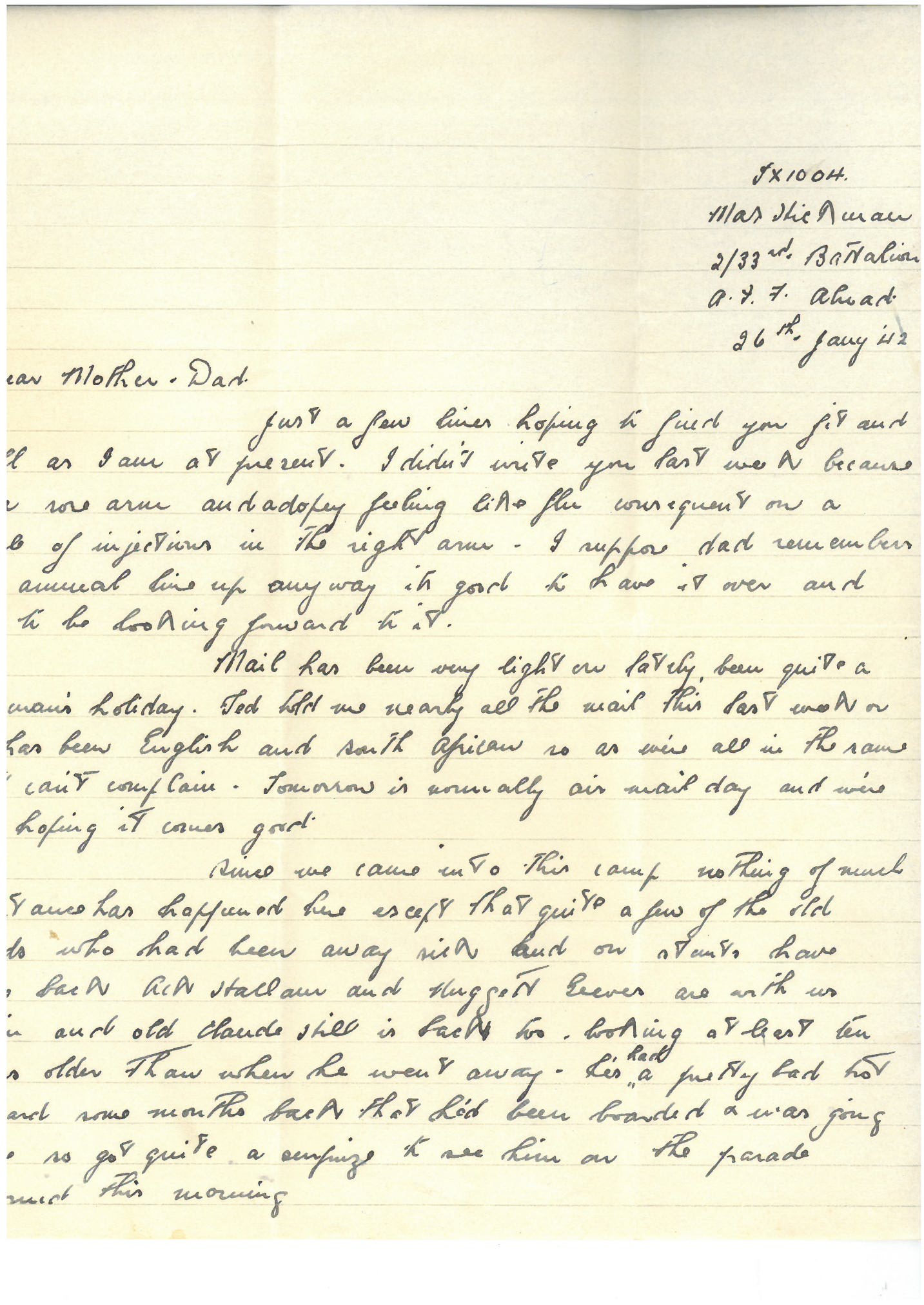 Just a few lines hoping to find you fit and well as I am at present. I didn’t write you last week because of a sore arm and a dopey feeling like flu consequent on a couple of injections in the right arm. I suppose dad remembers the annual line up. Anyway it’s good to have it over and not to be looking forward to it.
