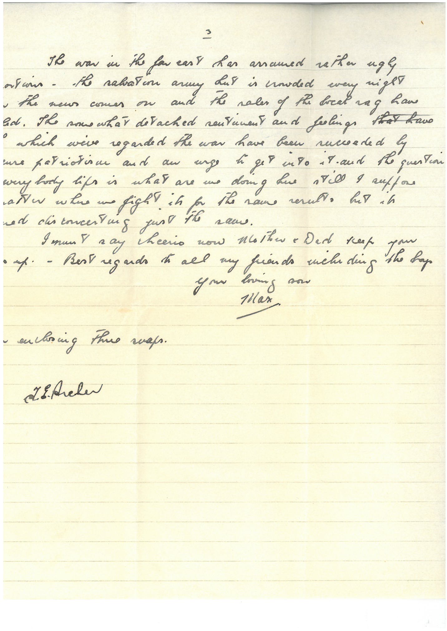 I must say cheerio now Mother & Dad. Keep your chins up. Best regards to all my friends, including the boys.