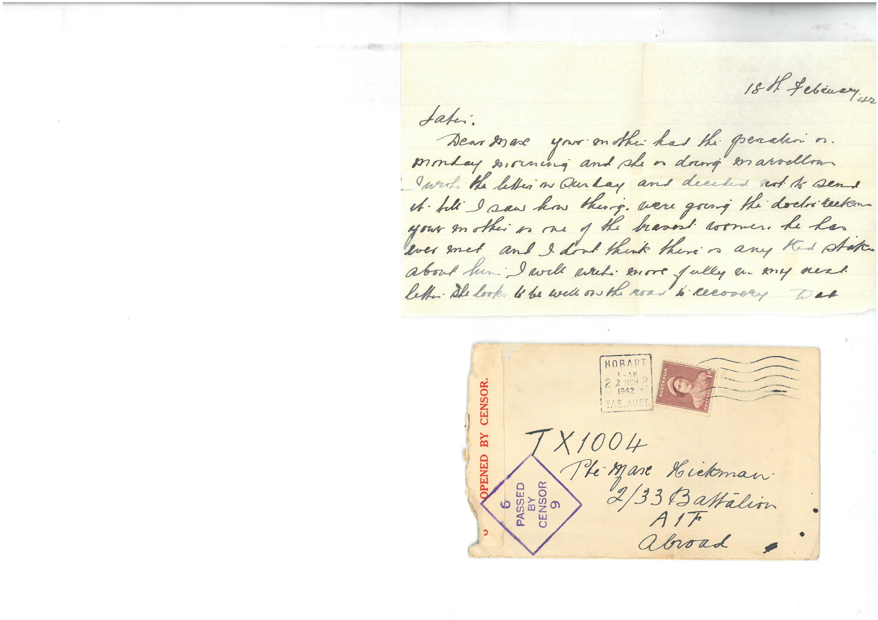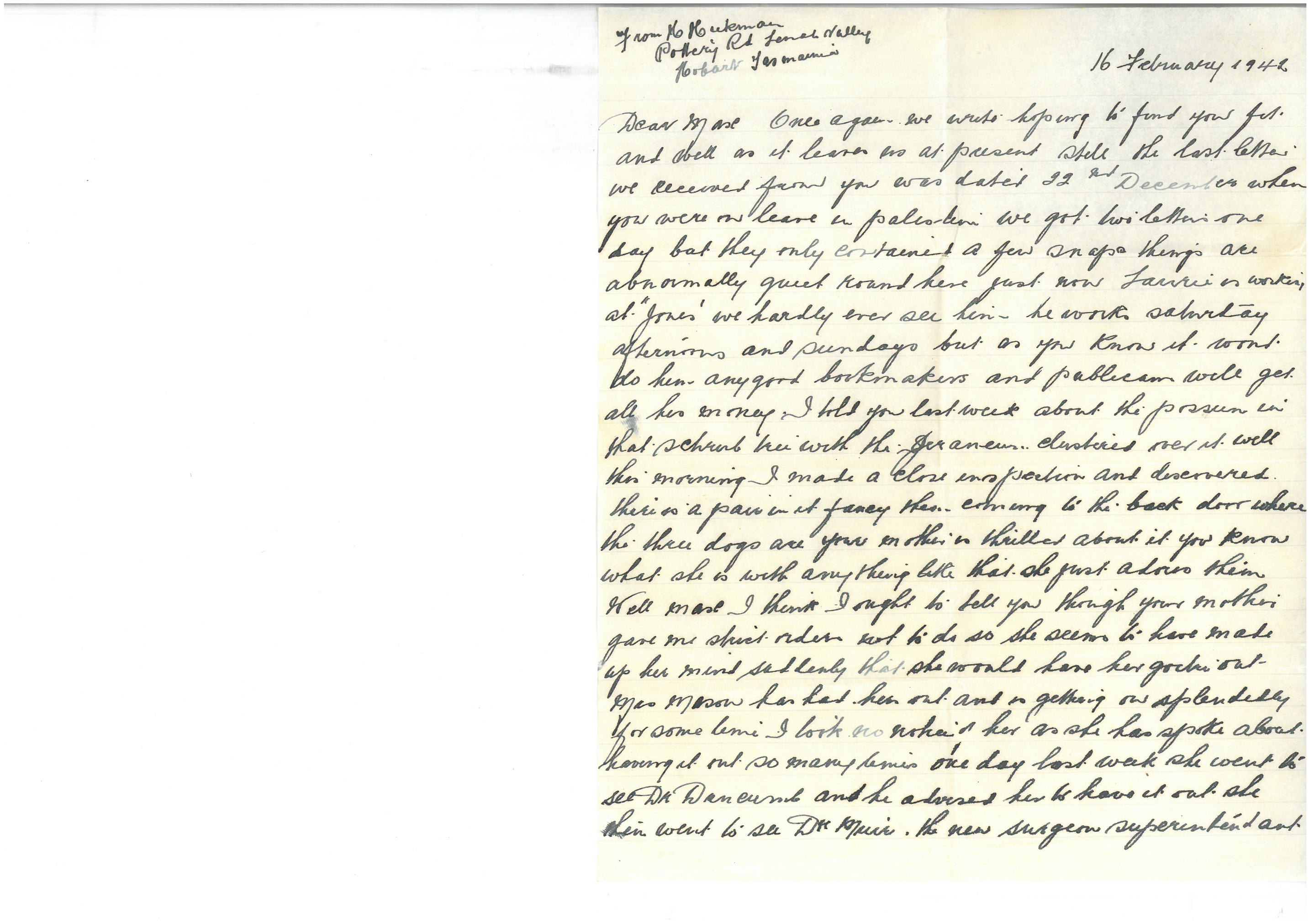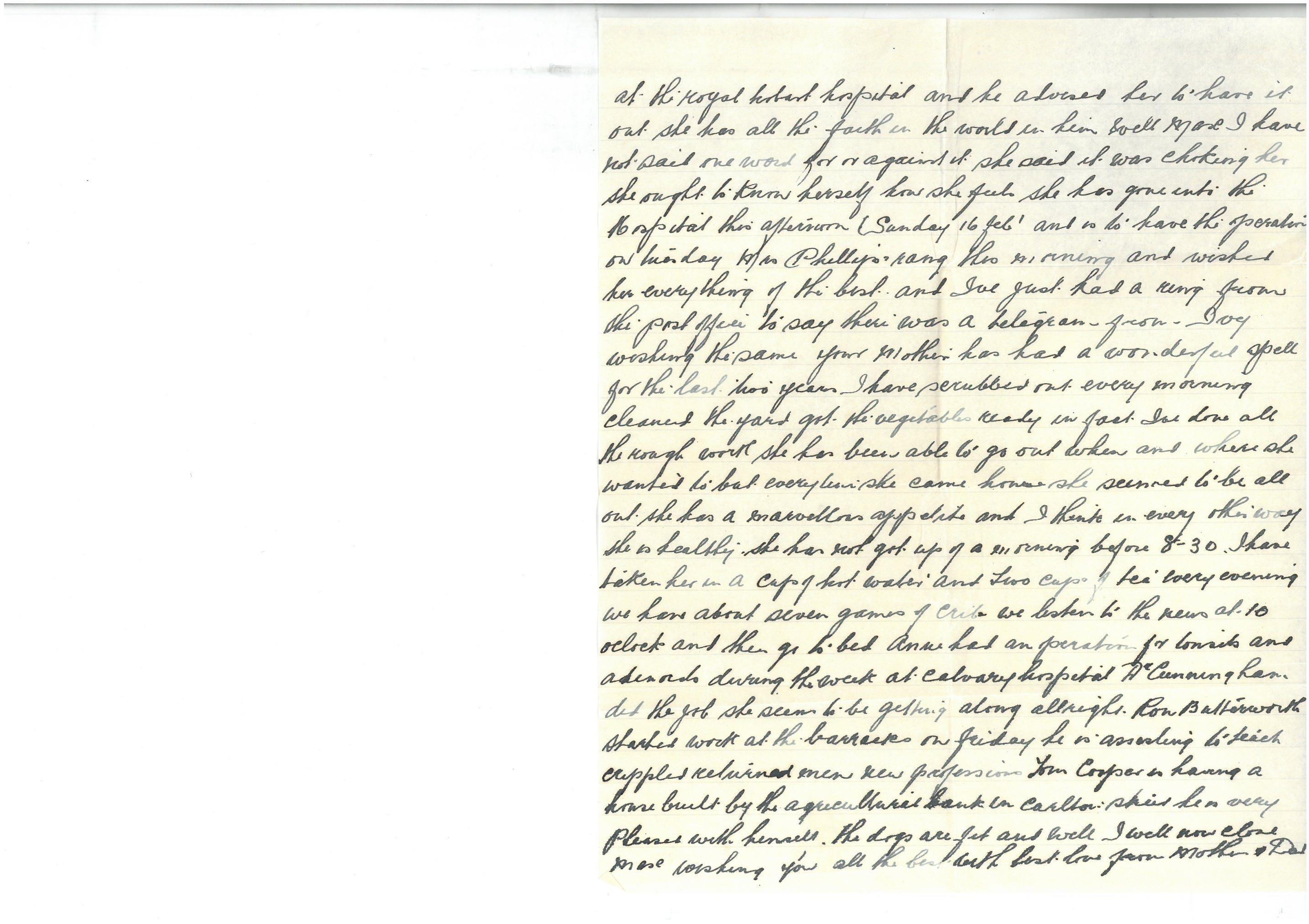 Once again we write hoping to find you fit and well as it leaves us at present. Still the last letter we received from you was dated 22nd December when you were on leave in Palestine. We got two letters one day but they only contained a few snaps.* Things are abnormally quiet around here just now. Laurie is working at Jones’. We hardly ever see him. He works Saturday afternoons and Sundays but as you know it won’t do him any good: bookmakers and publicans will get all his money. I told you last week about the possum in that schrub tree with the geranium clustered over it. Well this morning I made a close inspection and discovered there is a pair in it. Fancy them coming to the back door where the three dogs are. Your mother’s thrilled about it. You know what she is with anything like that. She just adores them. Well Max I think I ought to tell you though your mother gave me strict orders not to do so – she seems to have made up her mind suddenly that she should have her goitre out. Mrs Mason has had hers out and is getting on splendidly for some time. I took no notice of her as she has spoken about having it out so many times (but) one day last week she went to see Dr D….. and he advised her to have it out. She then went to see Dr Muir, the new surgeon superintendent at the Royal Hobart Hospital and he advised her to have it out. She has all the faith in the world in him. Well Max I have not said one word for or against it. She said it was choking her. She ought to know herself how she feels. She has gone into the hospital this afternoon (Sunday 16th Feb) and is to have the operation on Tuesday. Mrs Phillips rang this morning and wished her everything of the best and I’ve just had a ring from the Post Office to say there was a telegram from Ivy wishing the same. Your mother has had a wonderful spell for the last two years. I have scrubbed out every morning, cleaned the yard, got the vegetables ready – in fact I’ve done all the rough work. She has been able to go out when and where she wanted to, but every time she came home she seemed to be all out. She has a marvellous appetite and I think in every other way she is healthy. She has not got up of a morning before 8.30. I have taken her in a cup of hot water and two cups of tea. Every evening we have about seven games of crib. We listen to the news at 10 o’clock and then go to bed. Anne had an operation for tonsils and adenoids during the week at Calvary hospital. Dr Cunningham did the job. She seems to be getting along alright. Ron Butterworth started work at the barracks on Friday. He is attempting (?) to teach crippled returned men new professions. Tom Cooper is having a house built by the agricultural bank in Carlton Street. He’s very pleased with himself. The dogs are fit and well. I will now close Max. Wishing you all the best. With best love from Mother & Dad.
