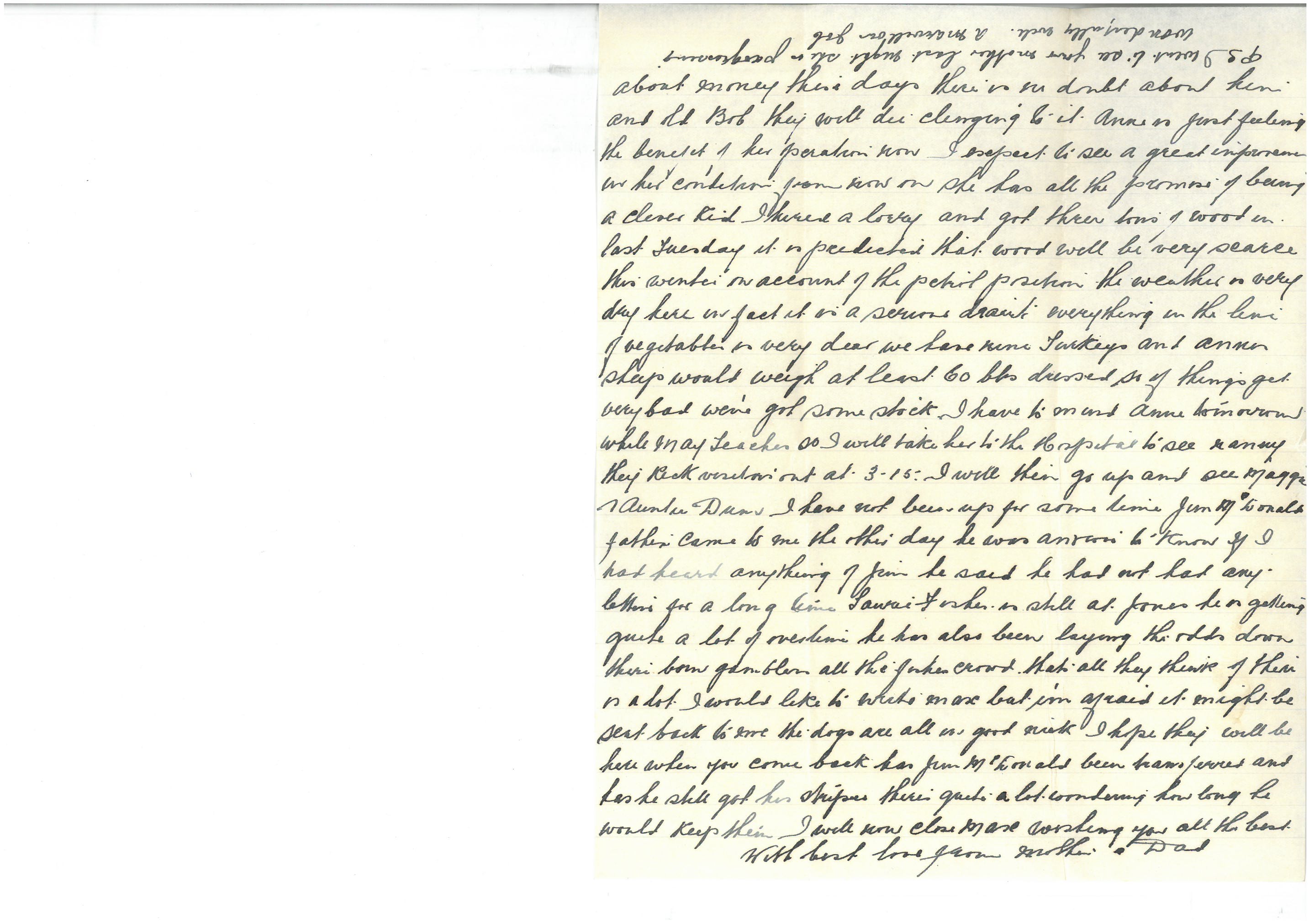 Just a few lines hoping to find you fit and well as it leaves me at present. Well, up to date your mother is making a marvellous recovery. When I saw her on Friday I could hardly believe my own eyes. I am not going in today – Sunday – because I know she is going to have quite a number of visitors. You know this operation might put another twenty years on your mother’s life. In fact I don’t think she could have gone much longer the way she was, so I think she took the right course in having it done while she and the necessary strength. Things are frightfully quiet here just now. The war has reached our shores and the people are waking out of their complacency. I noticed as I walked down Pottery Road yesterday about the fourth house up from the terminus there is a heap of sand for putting out incendiary combs. All the people around are invited to take some in readiness. I was up at the club on Friday afternoon. There was a large gathering of old timers discussing the merits of old and new AIF. Quite a lot of them wanting to have another shot but I don’t think they would stand up to another preparation. Old Jack Hickman is in Calvary hospital. He has had bronchial pneumonia and he had to be X-rayed so they took him there for a few days. He was thinking of the cost when I saw him. Fancy worrying about money these days. There is no doubt about him and old Bob – they will die clinging to it. Anne is just feeling the benefit of her operation. I expect to see a great improvement in her condition from now on. She has all the promise of being a clever kid. I hired a lorry and got three tons of wood in last Tuesday. It is predicted that wood will be very scarce this winter on account of the petrol position. The weather is very dry here. In fact it is a serious drought. Everything in the line of vegetables is very dear. We have nine turkeys and Anne’s sheep would weigh at least 60lbs dressed so if things get very bad we’ve got some stock. I have to mind Anne tomorrow while May teaches so I will take her to the hospital to see nanny. They kick visitors out at 3.15. I will then go up and see Maggie & Auntie Dunn(?). I have not been up for some time. Jim McDonald’s father came to me the other day. He was anxious to know if I had heard anything of Jim. He said he had not had any letters for a long time. Laurie Fisher is still at Jones’. He is getting quite a lot of overtime. He has also been laying the odds down. There’s born gamblers – all the Jokers crowd – that’s all they think of. There is a lot I would like to write Max but I’m afraid it might be sent back to me. The dogs are all in good nick. I hope they will be here when you come back. Has Jim McDonald been transferred and has he still got his stripes? There’s quite a lot wondering how long he would keep them. I will now close Max. Wishing you all the best. With best love from Mother & Dad.