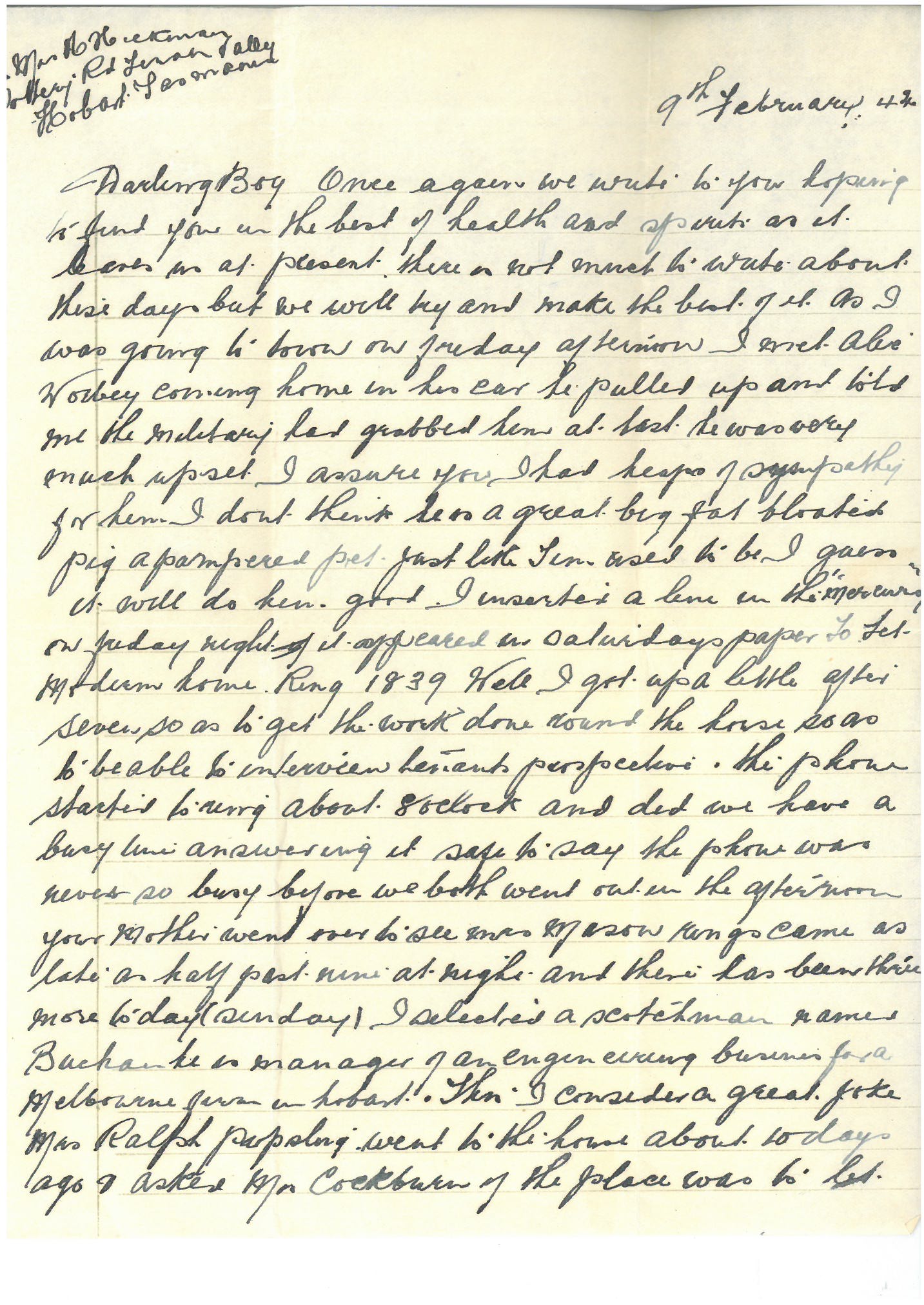 Darling Boy. Once again we write to you hoping to find you in the best of health and spirits as it leaves us at present. there is not much to write about these days but we will try and make the best of it. As I was going to town on Friday afternoon I met Alec Worbey coming home in his car. He pulled up and told me the military had grabbed him at last. He was vey much upset. I assure you I had heaps of sympathy for him – I don’t think. He’s a great big fat bloated pig – a pampered pet, just like Tim used to be I guess. It will do him good. I inserted a line in the Mercury on Friday night. It appeared in Saturday’s paper. To Let – Modern Home. Ring 1839. Well I got up a little after seven so as to get the work done around the house so as to be able to interview tenants prospective. The phone started to ring about 8 o’clock and did we have a busy time answering it. Safe to say the phone was never so busy before. We both went out in the afternoon. Your mother went over to see Mrs Mason. Rings came as late as half past nine at night and there has been three more today (Sunday). I selected a Scotchman – name’s Buchan. He is manager of an engineering business for a Melbourne firm in Hobart. This I consider a great joke: Mrs Ralph Propsting went to the house about 10 days ago & asked Mrs Cockburn if the place was to let. She told Mrs Cockburn that her husband was a ‘professor’ at the University & a great friend of Max Hickman. He was now on loan to the government in the munitions business for the duration of the war. Mr Lowenstein told me he is (in fact) a foreman of some sort making ‘gun sights’. His wife rang me and did I have to listen to a tirade of pleading and did she stress the great friendship of her husband for you. She simply would not take no for an answer. We had it let to a man in the Mercury offer but he was called up for the military.