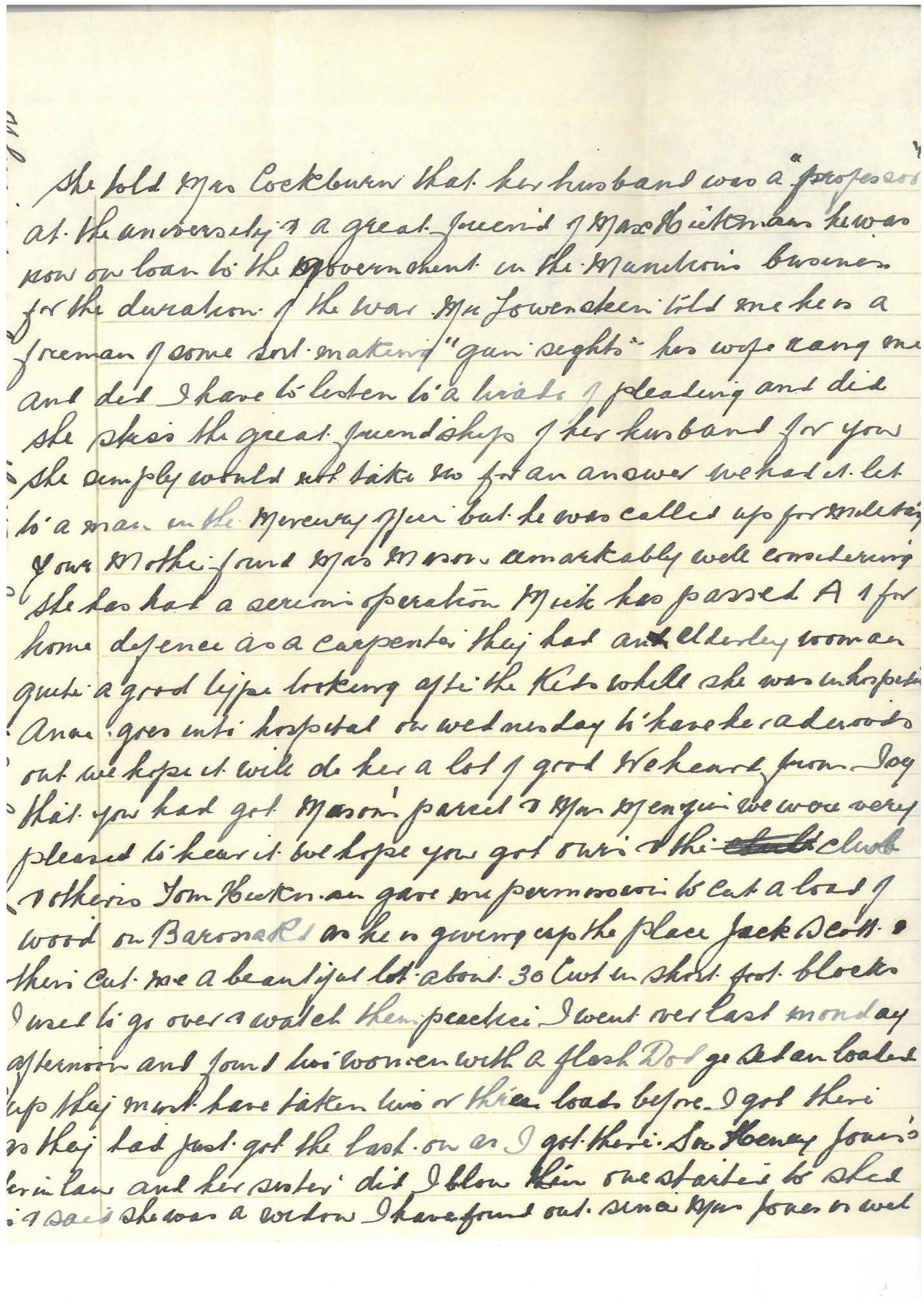 Your mother found Mrs Mason remarkably well considering she has had a serious operation. Mick has passed A1 for home defence as a carpenter. They had an elderly woman, quite a good type, looking after the kids while she was in hospital. Anne goes into hospital on Wednesday to have her adenoids out. We hope it will do her a lot of good. We heard from Ivy that you had got Mason’s parcel & Mae Menzie’s. We were very pleased to hear it but hope you got ours & the club & others. Tom Hickman gave me permission to cut a load of wood on Barossa Rd as he is giving up the place. Jack Scott then cut me a beautiful lot, about 30cwt in short foot blocks. I used to go over & watch them practice. I went over last Monday afternoon and found two women with a flash Dodge sedan loaded up. They must have taken two or three loads before I got there. As they had just got the last load on as I got there – saw Henry Jones’ sister in law and her sister. Did I blow them! One started to shed tears & said she was a widow. I have found out since Max Jones is well & living in a house worth 1500. I was a fool. I should have made them pay but on the spur of the moment I let them go. The last letter we had was dated 22 December. The dogs are fit and well. Will now close. God bless and keep you. From Mother & Dad.