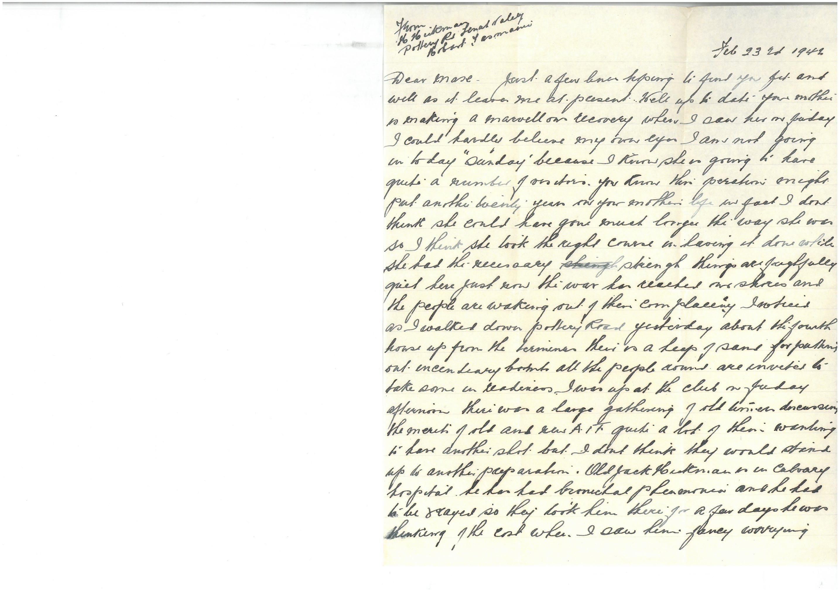 Your mother had the operation on Monday morning and she is doing marvellous. I wrote the letter on Sunday and decided not to send it till I saw how things were going. The doctor reckons your mother is one of the bravest women he has ever met and I don’t think there’s any ….about him. I will write more fully in my next letter. She looks to be well on the road to recovery. Dad