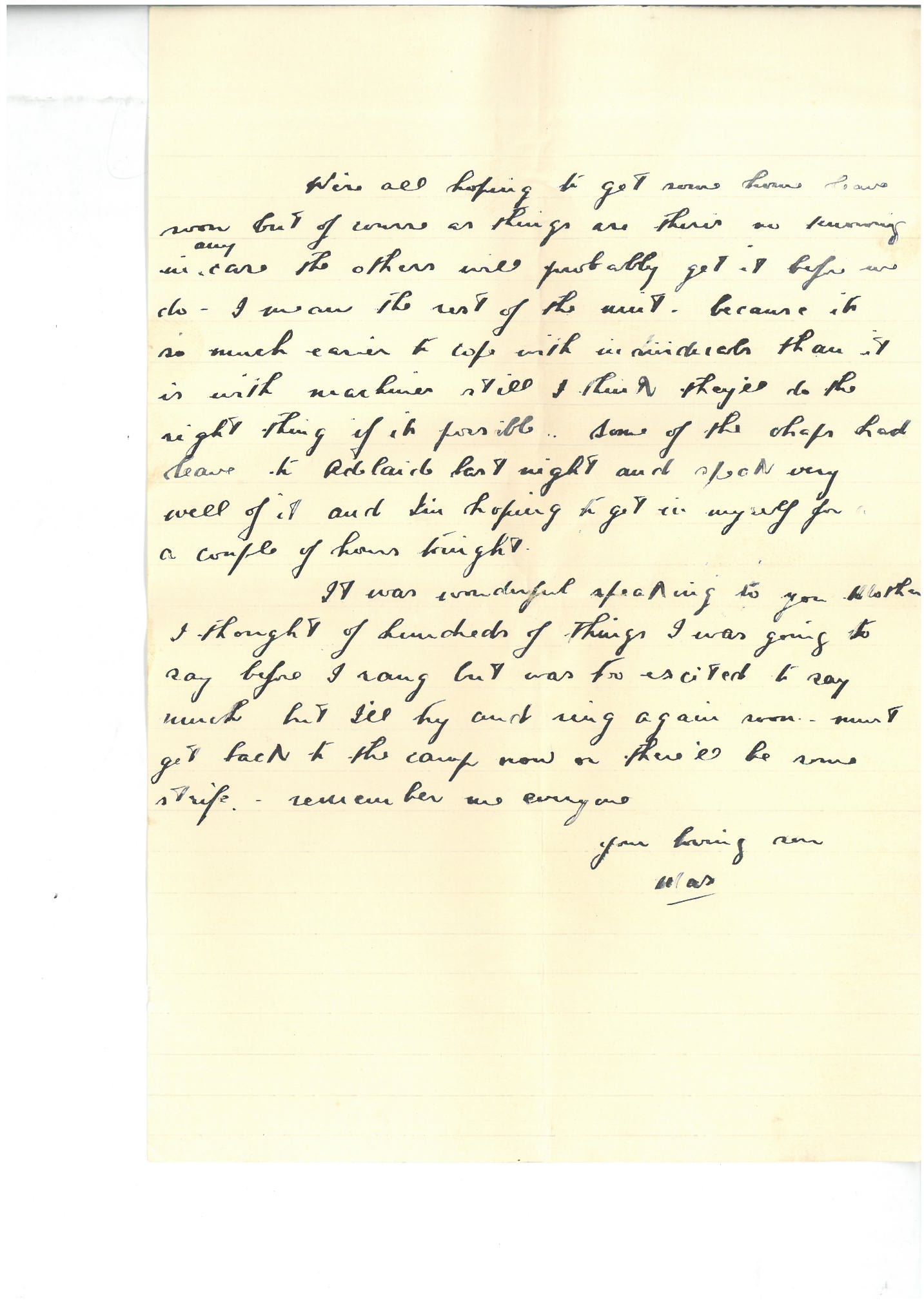 It was wonderful speaking to you Mother. I thought of hundreds of things I was going to say before I rang but was too excited to say much, but I’ll try and ring again soon. Must her back to the camp now or there’ll be some strife. Remember me (to) everyone.