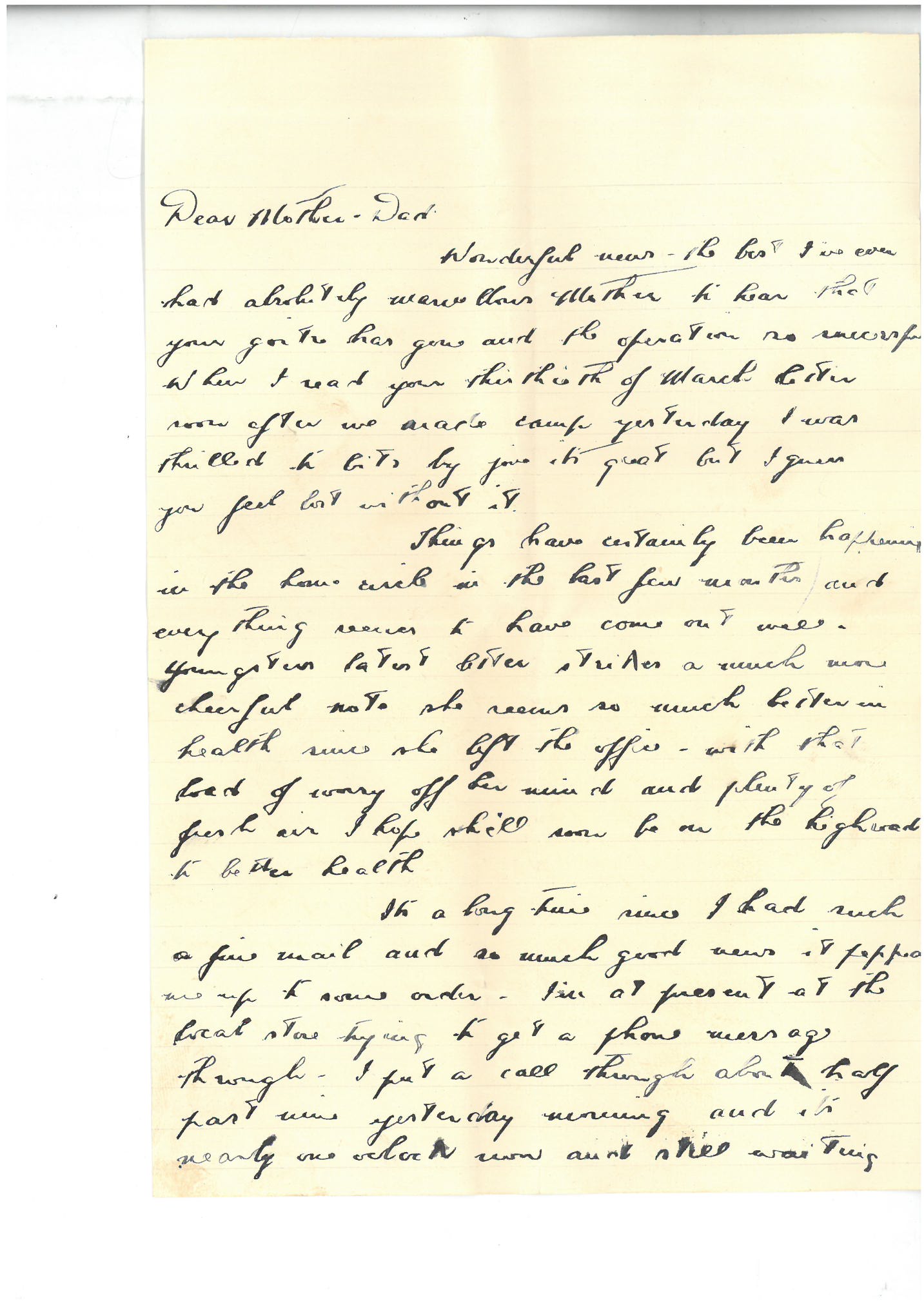 Mother and Dad’s letter of March thirtieth (actually dated 29th)