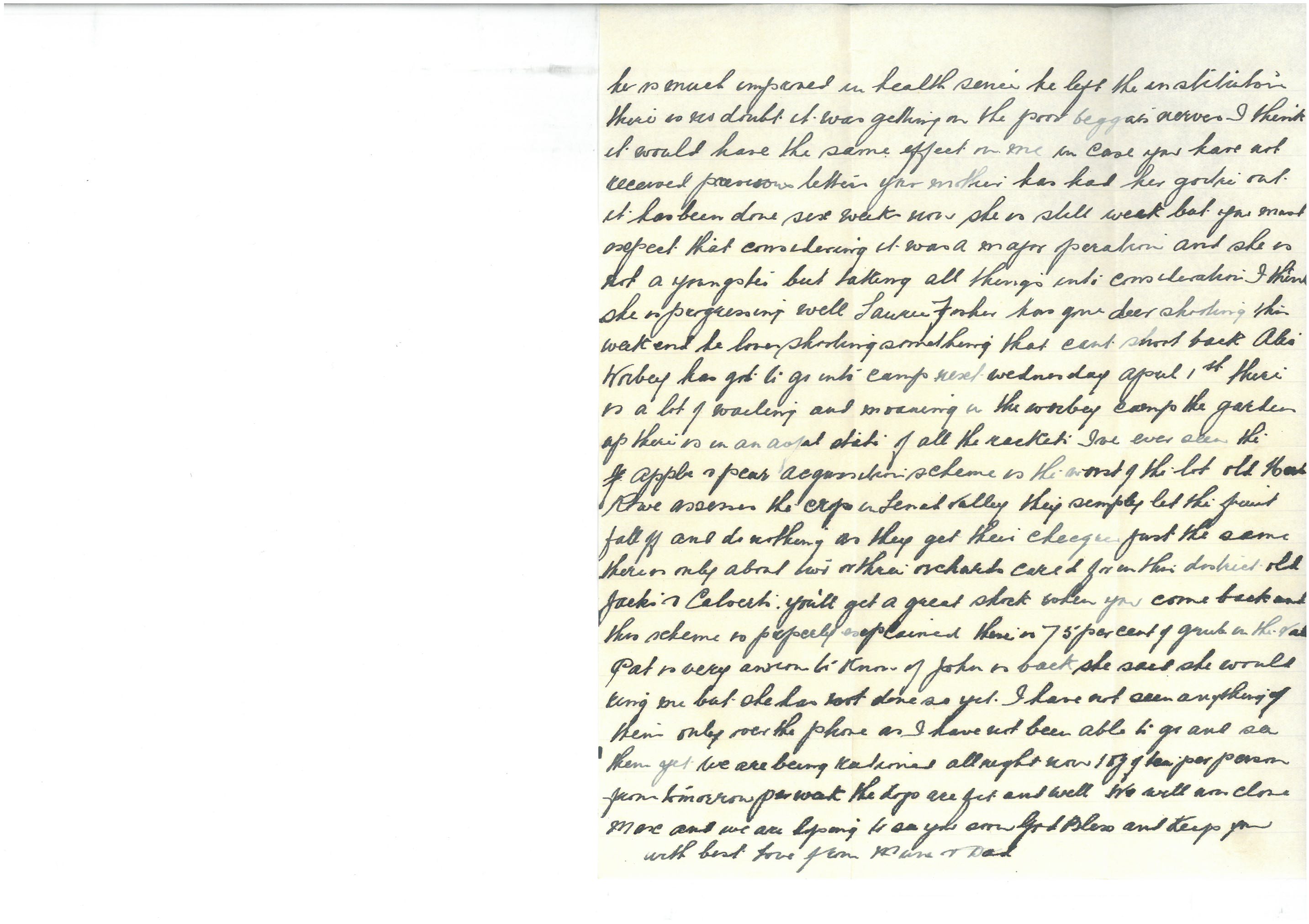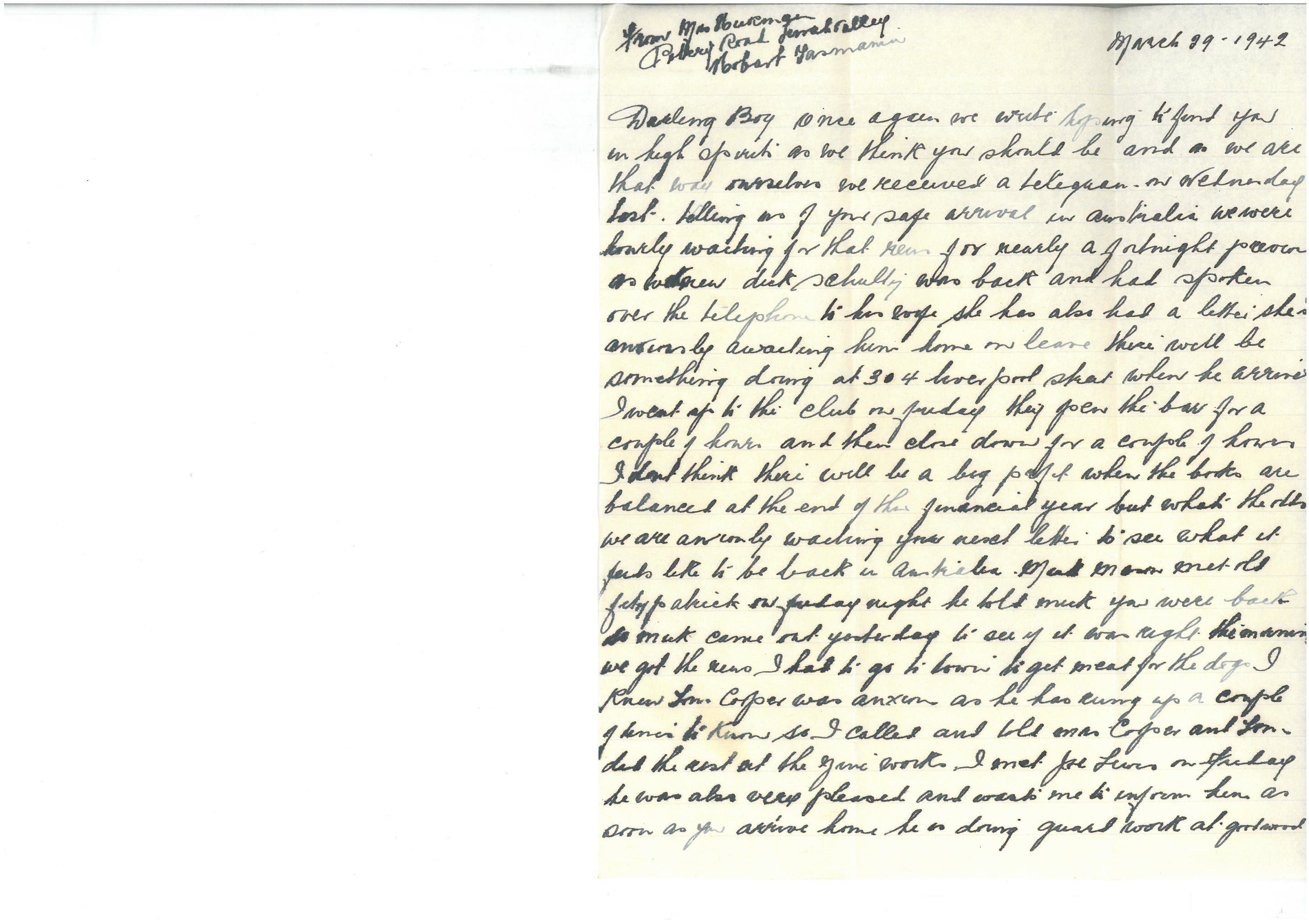 Darling Boy. Once again we write hoping to find you in high spirits as we think you should be and as we are that way ourselves. We received a telegram on Wednesday last telling us of your safe arrival in Australia. We were hourly waiting for that news for nearly a fortnight as we knew Dick Schultz was back and had spoken over the telephone to his wife. She has also had a letter. She’s anxiously waiting him home on leave. There will be something doing at 304 Liverpool Street when he arrives. I went up to the club on Friday. They open the bar for a couple of hours and then close down for a couple of hours. I don’t think there will be a big profit when the books are balanced at the end of the financial year, but what’s the odds? We are anxiously waiting your next letter to see what it feels like to be back in Australia. Mick Mason met old Fitzpatrick on Friday night. He told Mick you were back so Mick came out yesterday to see if it was right. The morning we got the news I had to go to town to get meat for the dogs. I knew Tom Cooper was anxious as he has rung up a couple of times to know so I called and told Mrs Cooper and Tom did the rest at the Zinc Works. I met Joe Lewis on Friday. He was also very pleased and wants me to inform him as soon as you arrive home. He is doing guard work at Goodwood. He is much improved in health since he left the institution. There is no doubt it was getting on the poor beggar’s nerves. I think it would have the same effect on me. In case you have not received previous letters your mother has had her goitre out. It has been done six weeks now. She is still weak but you must expect that considering it was a major operation and she is not a youngster, but taking all things into consideration I think she is progressing well. Laurie Fisher has gone deer shooting this week end. He loves shooting something that can’t shoot back. Alex Worbey has got to go into camp next Wednesday April 1st. There is a lot of wailing and moaning in the Worbey camp. The garden up there is in an awful state. Of all the rackets I’ve ever seen then apple & pear acquisition scheme is the worst of the lot. Old Mark Rowe(?) assesses the crops in Lenah Valley. They simply let the fruit fall off and do nothing as they get their cheque just the same. There’s only about two or three orchards cared for in this district: old Jack’s and Calvert’s. You’ll get a great shock when you come back and this scheme is properly explained. There’s 75 percent of grub in the Valley. Pat is very anxious to know if John is back. She said she would ring me but she has not done so yet. I have not seen anything of them – only over the phone as I have not been able to go and see them yet. We are being rationed all right now – 1oz of tea per person from tomorrow per week. The dogs are fit and well. We will now close Max and we are hoping to see you soon. God bless and keep you with best love from Mum & Dad.