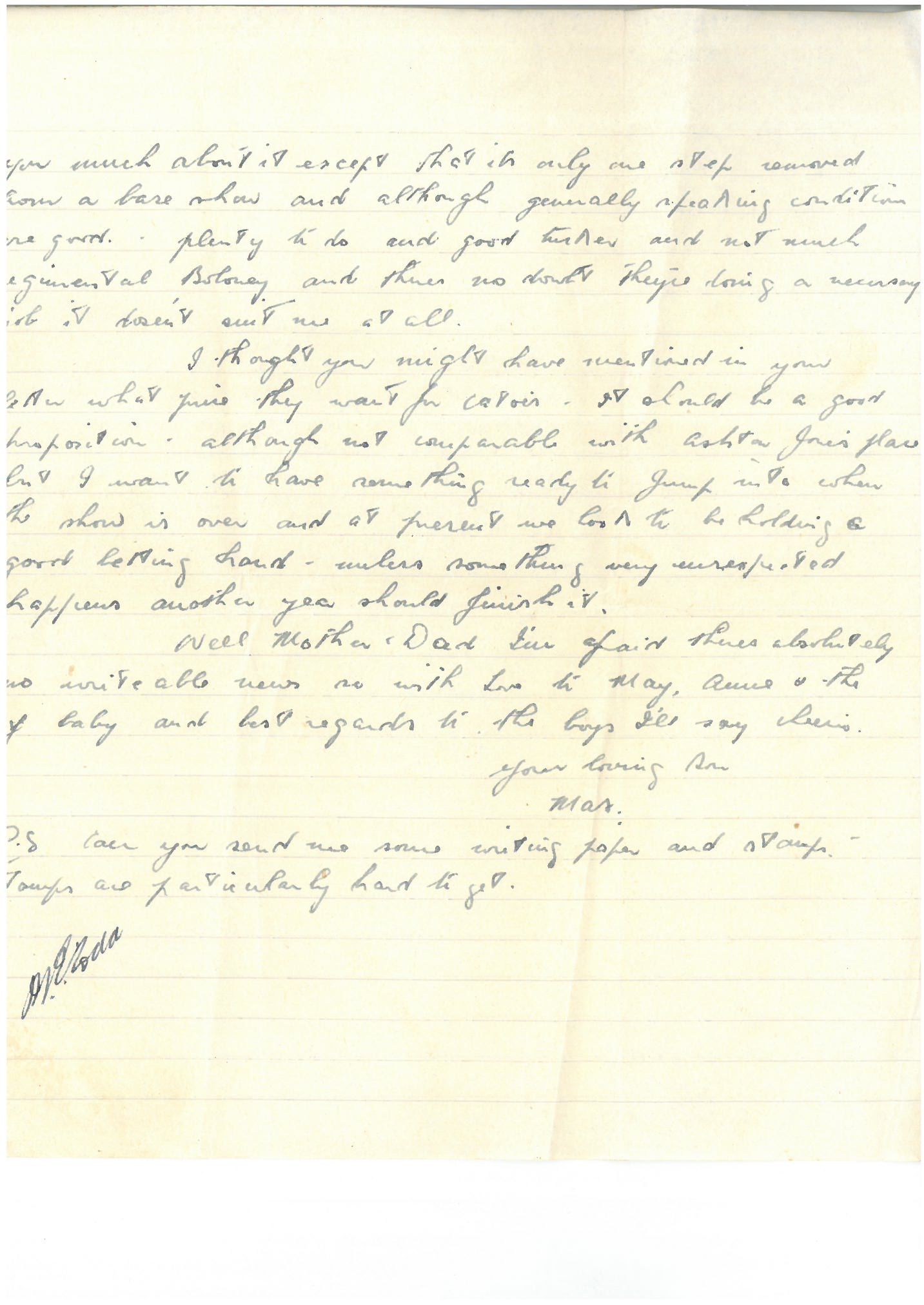 PS Can you send me some writing paper and stamps – stamps are particularly hard to get.