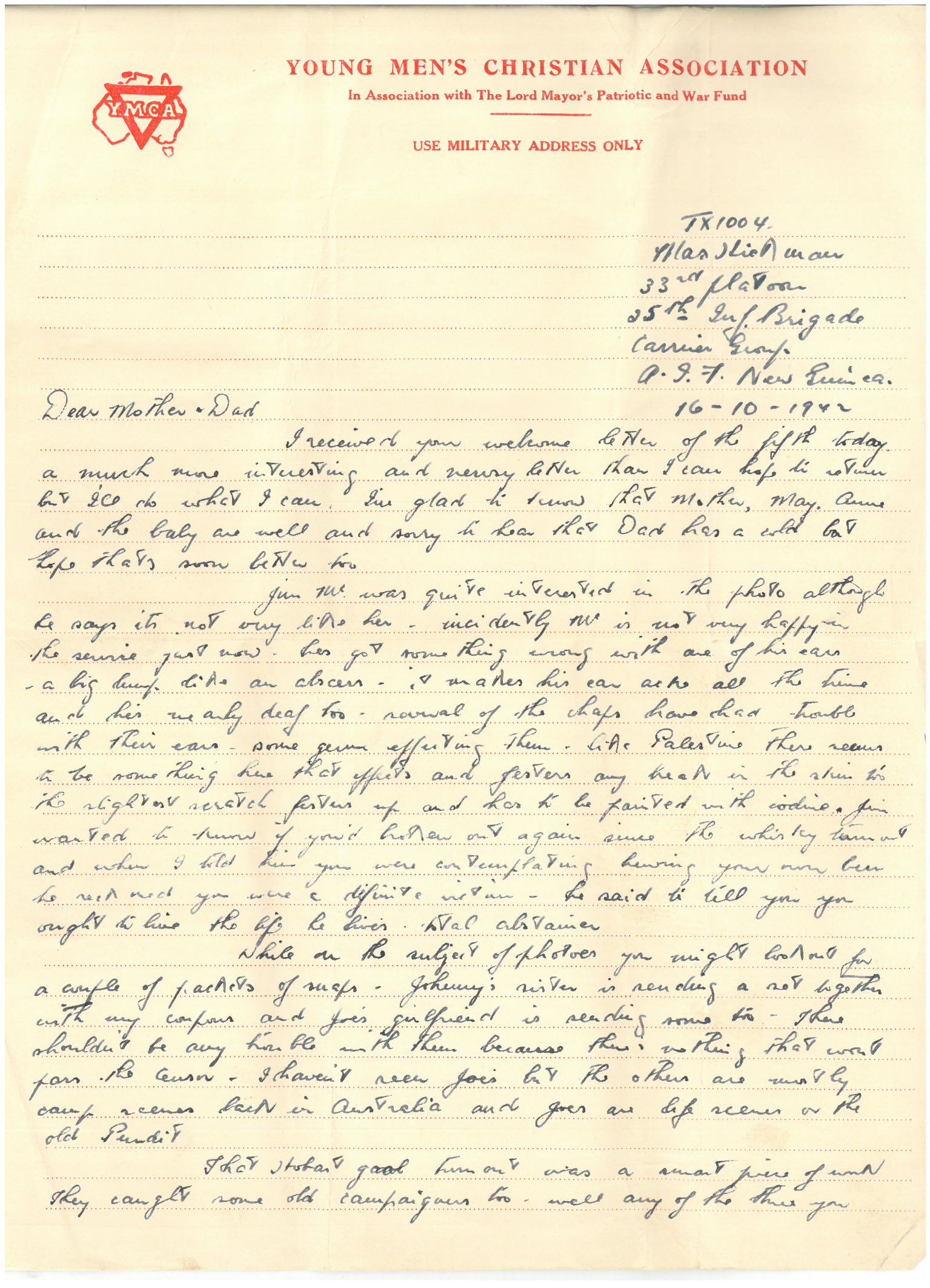 Your welcome letter of the 27th arrived today along with one from Mae Menzie and one from Mrs Toomey. All three very cheery and interesting but I was surprised to know you hadn’t had a letter from me since we came here as I had a letter from Youngster some days back in reply to one written about the nineteenth and I wrote home about the same time. Although if I remember rightly I think I made a bit of a tilt at a certain godly fraternity that may have caused a bit of a hold up.