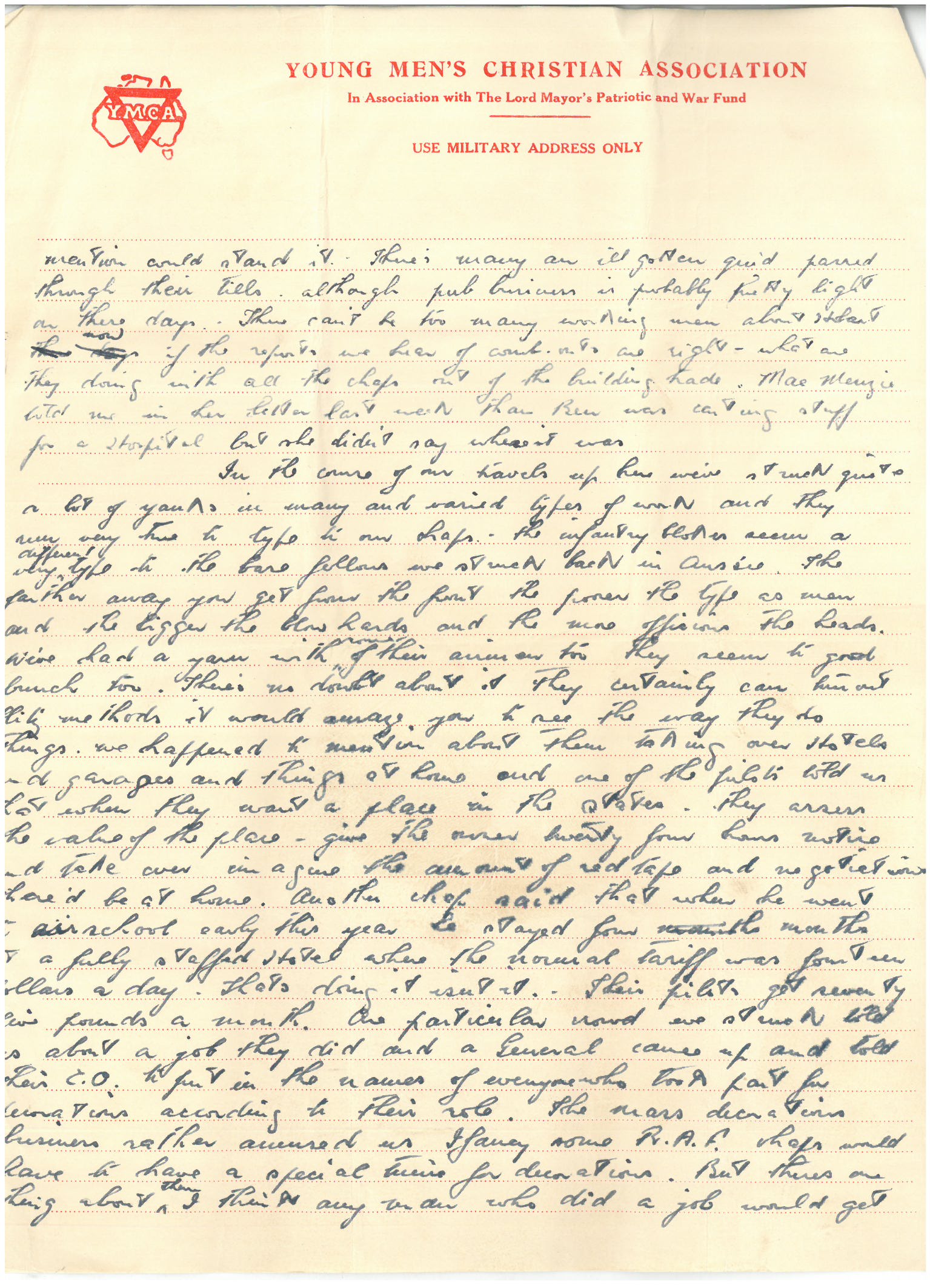 In the course of our travels up here we’ve struck quite a lot of Yanks in many and varied types of work and they seem very true to type to our chaps. The infantry blokes seem a very different type to the base fellows we struck back in Aussie. The farther away you get from the front, the poorer the type as men and the bigger the blow hards and the more officious the heads. We’ve had a yarn with some of their airmen- they seem a good bunch too. There’s no doubt abut it they certainly can turn out blitz (?) methods. It would amaze you to see the way they do things. We happened to mention about them taking over hotels and garages and things at home, and one of the pilots told us that when they want a place in the states they assess the value of the place, give the owner twenty four hours notice and take over. Imagine the amount of red tape and negotiations there’d be at home. Another chap said that when he went to school early this year he stayed four months at a fully staffed hotel where the normal tariff was fourteen dollars a day. That’s doing it, isn’t it. Their pilots get seventy five pounds (dollars?) a month. One particular crowd we struck told us about a job they did and a General came up and told their CO to put in the names of everyone who took part for decorations according to their role. The mass decorations business rather amused us. I fancy some RAF chaps would have to have a special tunic for decorations. But there’s one thing about them I think any man who did a job would get recognition.