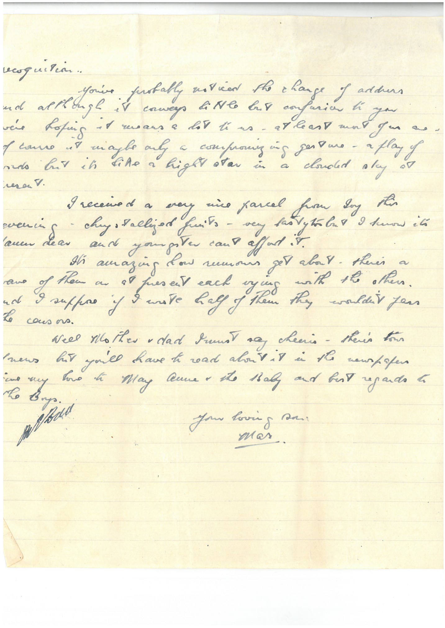 Well Mother & Dad I must say cheerio. there’s tons of news but you’ll have to read about it in the newspapers. Give my love to May, Anne & the baby and best regards to the boys.