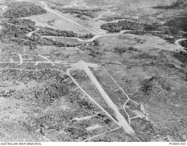 AWM P03664.003 Aerial view of Berry Drome (previously named Bomana Aerodrome) with the Laloki River winding through the background. The airstrip, situated approximately 20 kilometres north-east of Port Moresby, was used mainly by fighter and medium bomber aircraft.