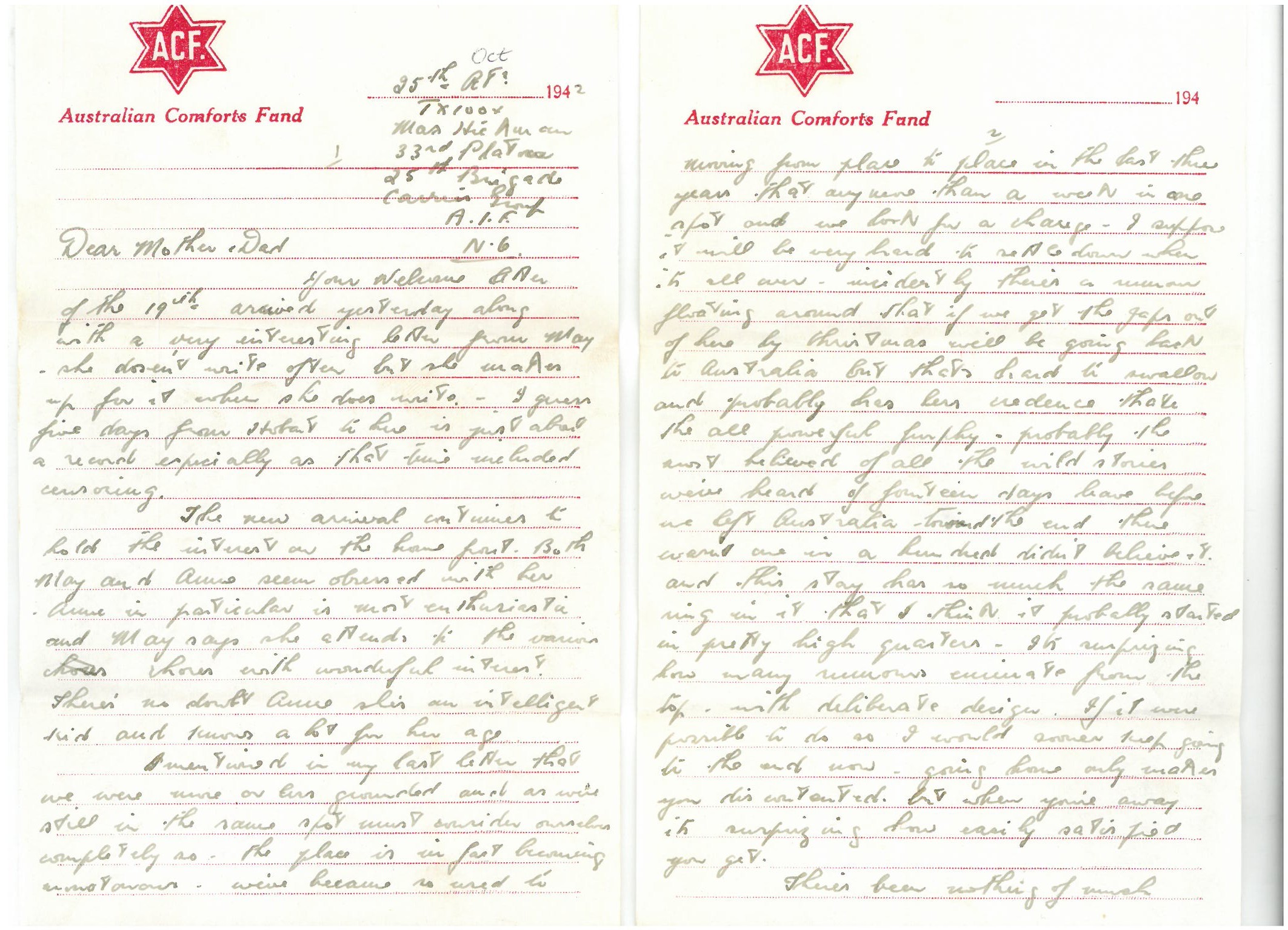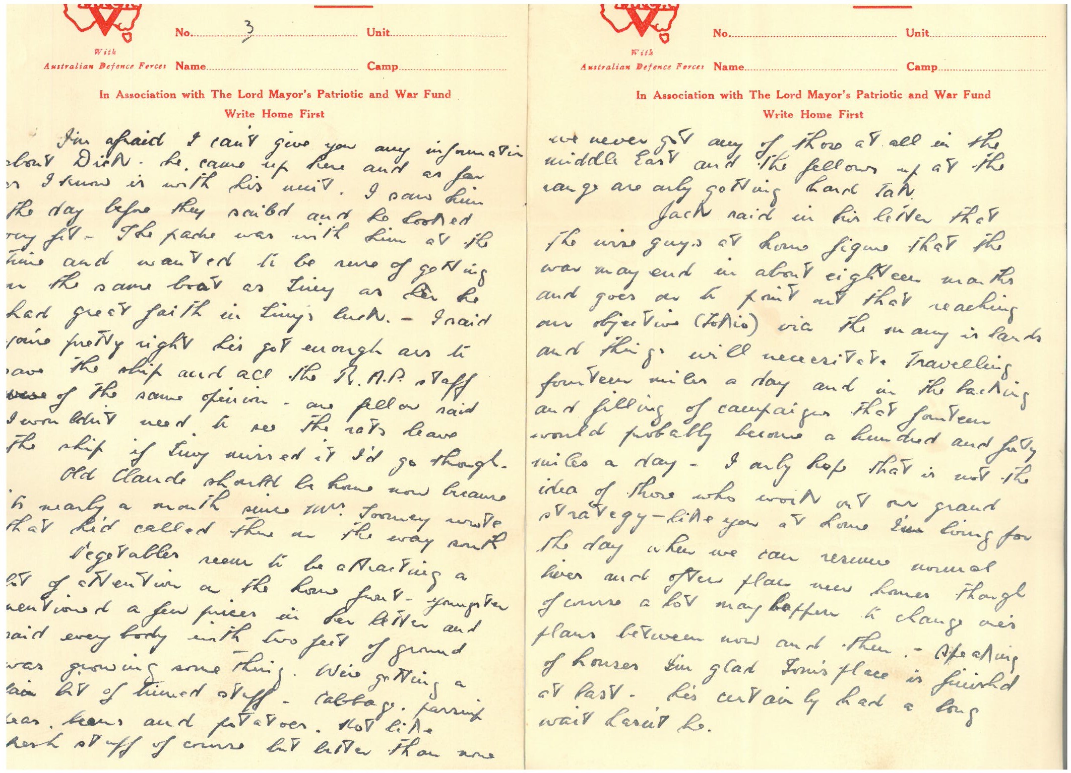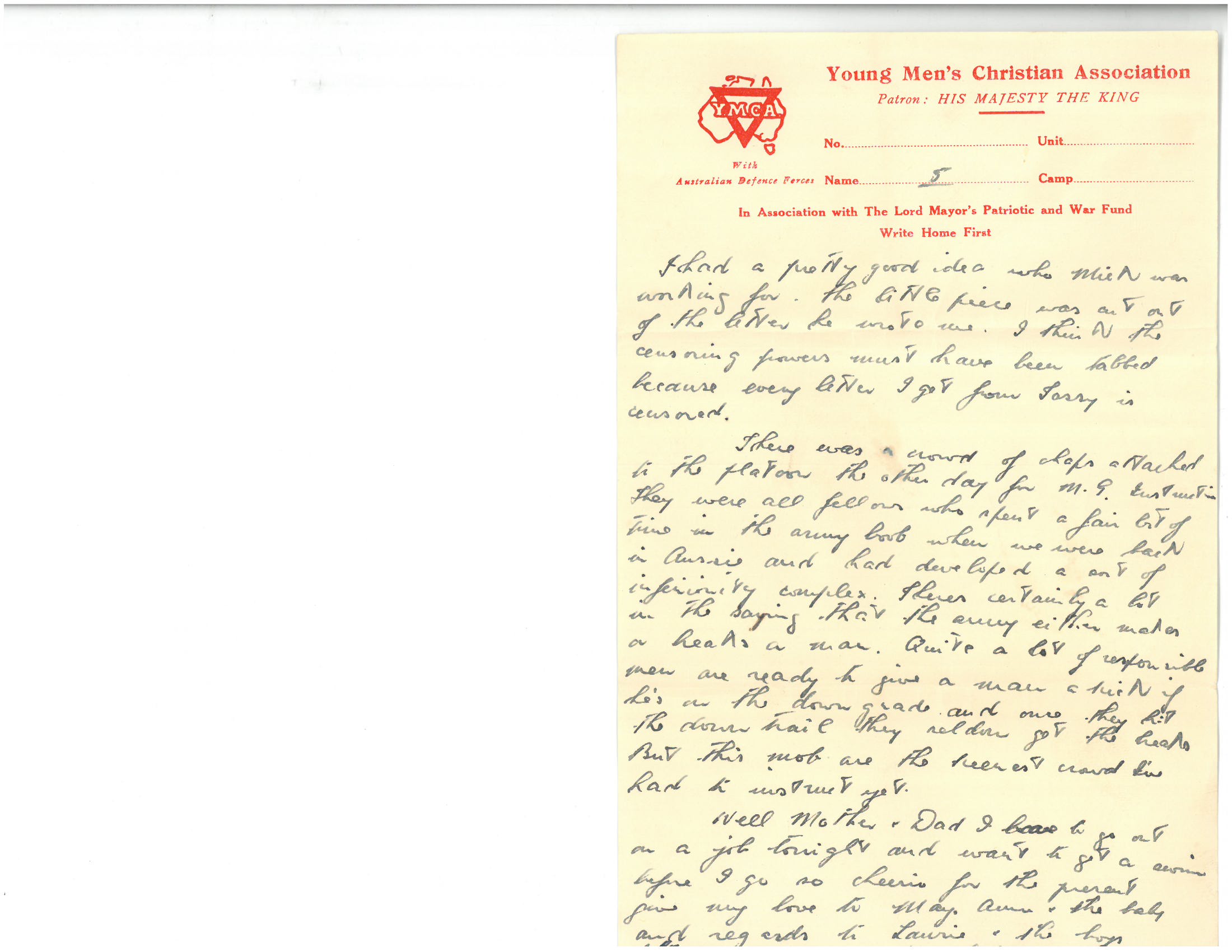 Your welcome letter of the 19th arrived yesterday along with a very interesting letter from May. She doesn’t write often but she makes up for it when she does write. I guess five days from Hobart to here is just about a record especially as that time included censoring.