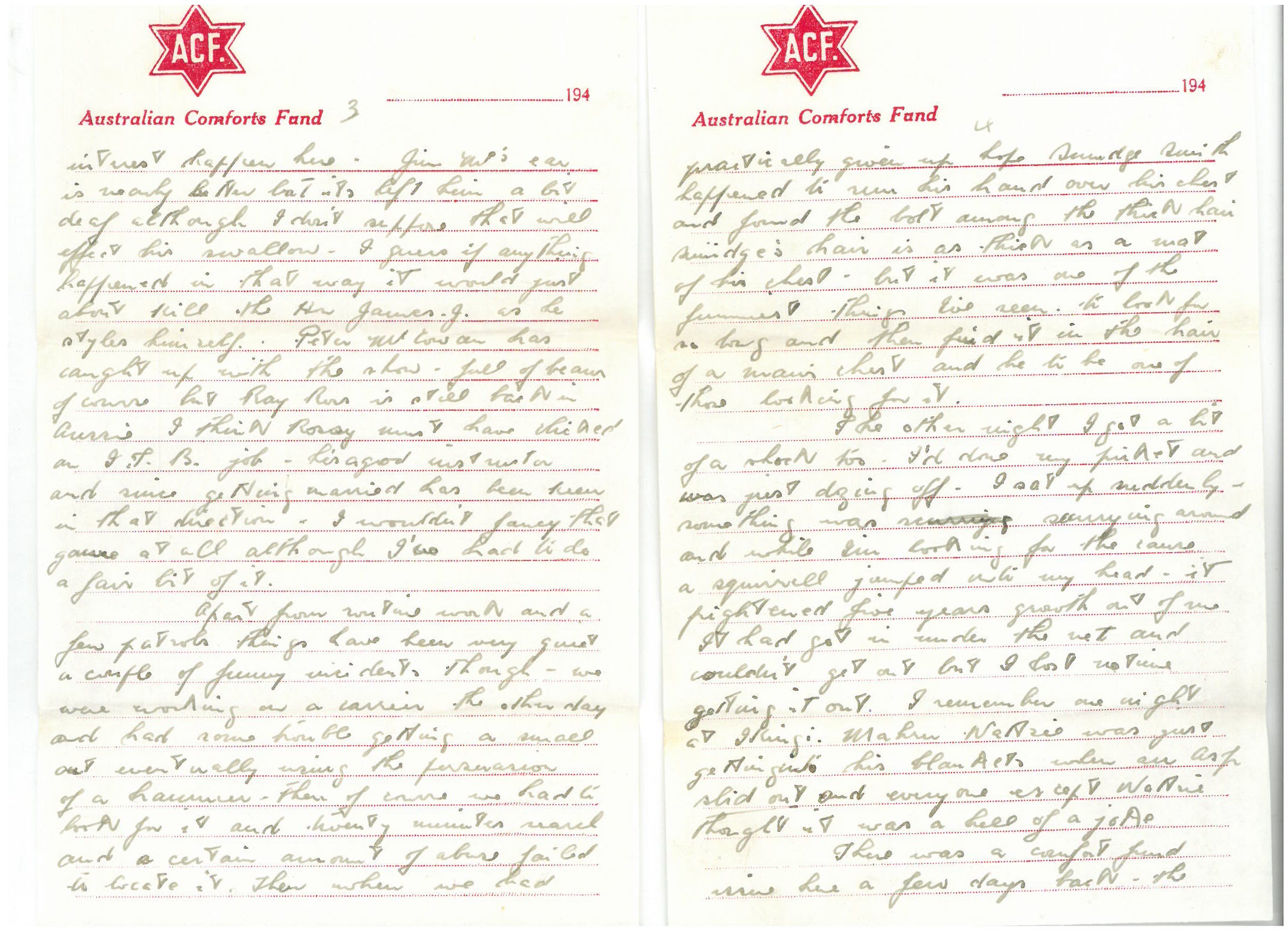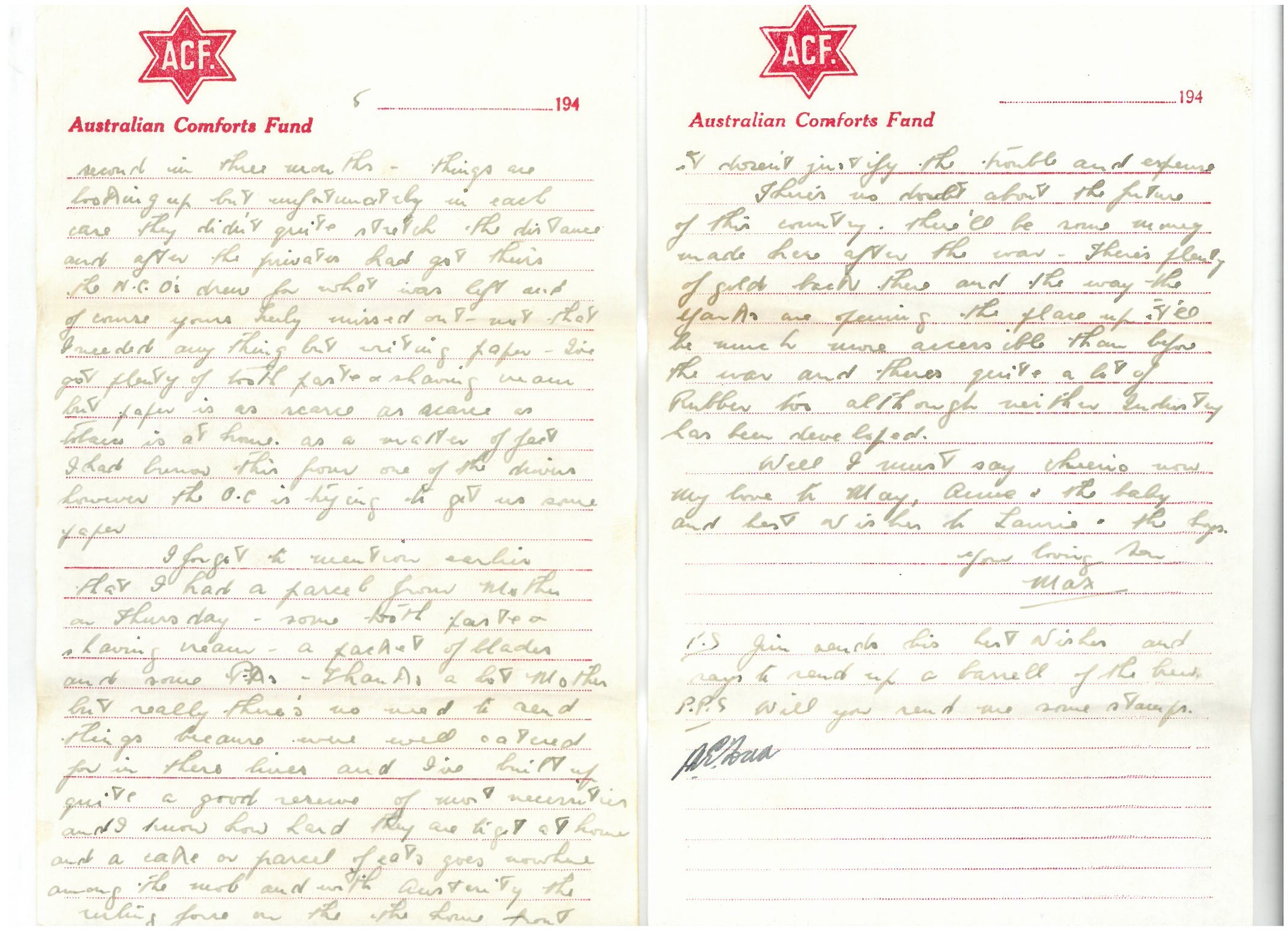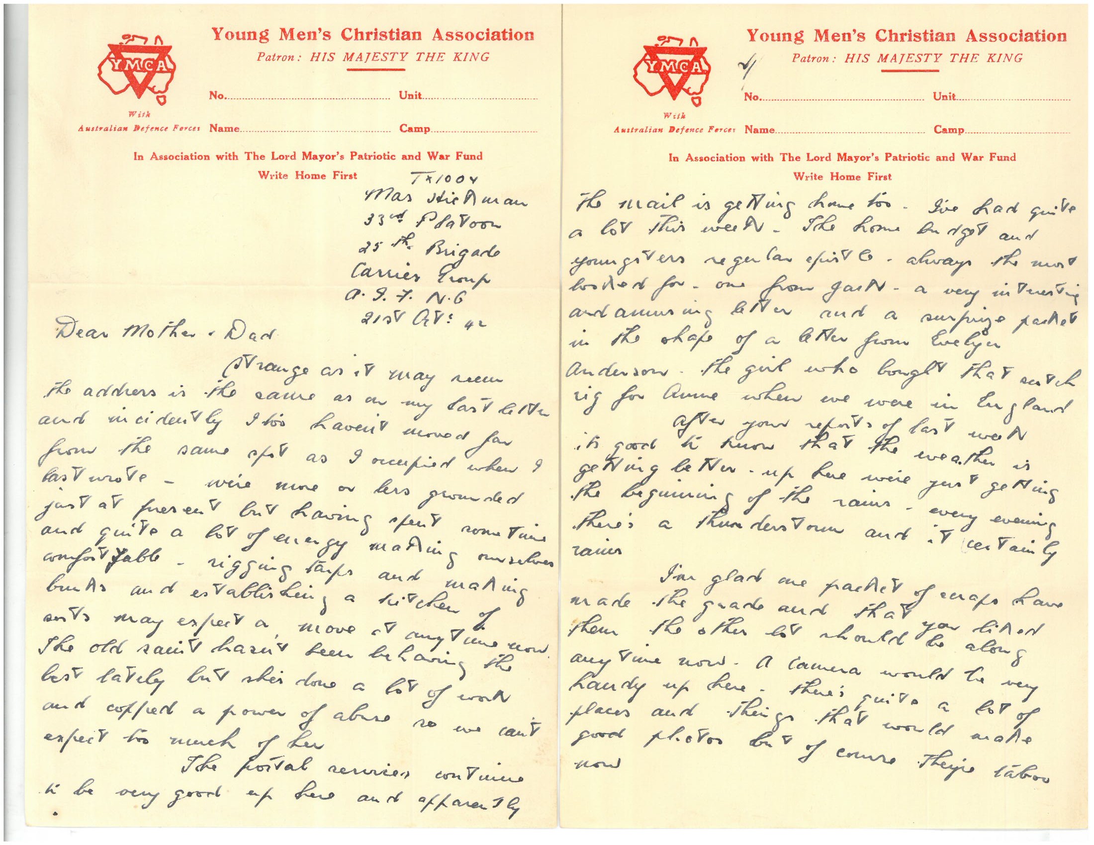 Your welcome letter of the 19th arrived yesterday along with a very interesting letter from May. She doesn’t write often but she makes up for it when she does write. I guess five days from Hobart to here is just about a record especially as that time included censoring.