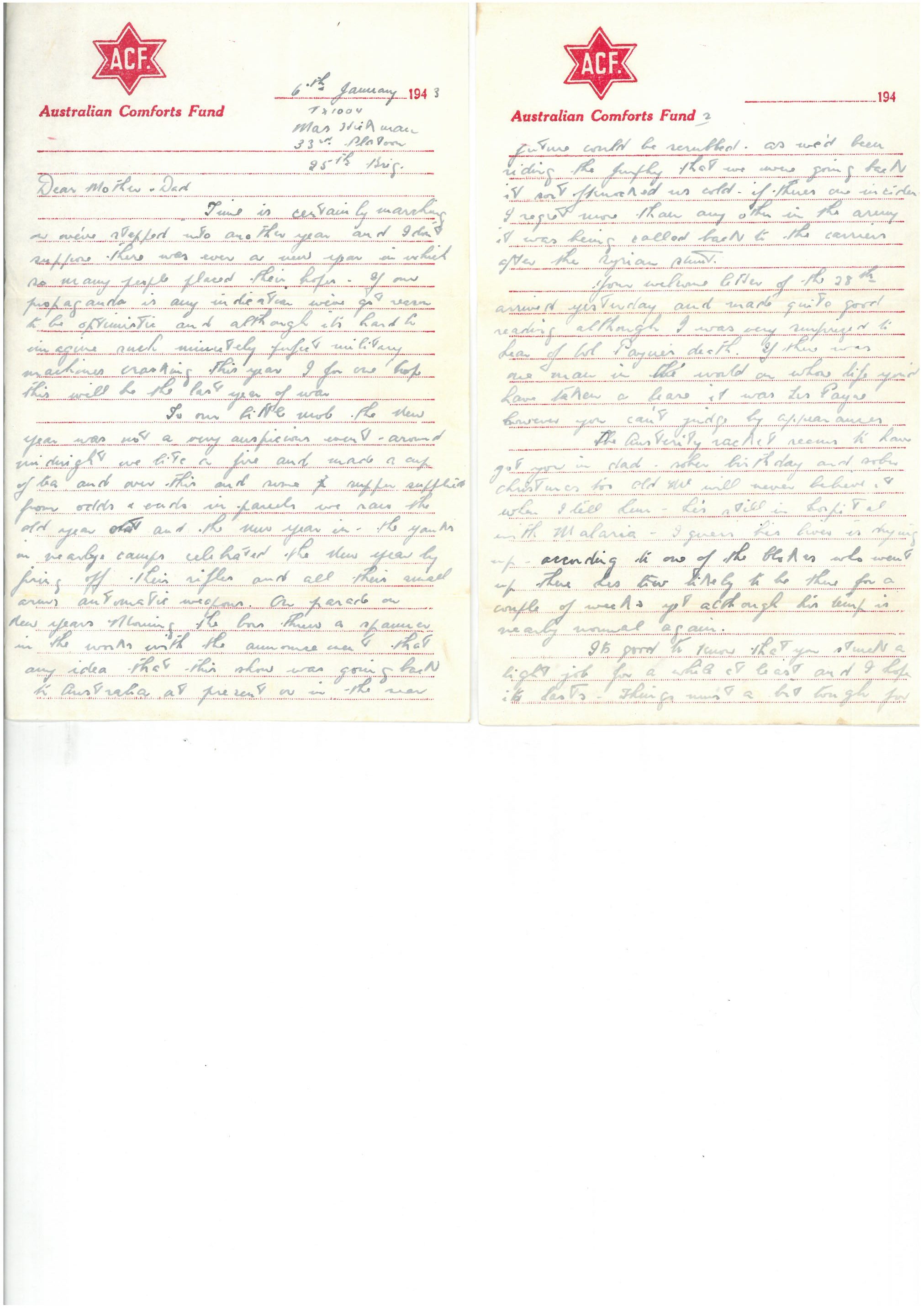 The Austerity racket seems to have got you in Dad – sober birthday and sober Christmas too. Old Mc will never believe it when I tell him. He’s still in hospital with Malaria. I guess his liver is drying up. According to one of the blokes who went up there he’s likely to be there for a couple of weeks yet, although his temp is nearly normal again.