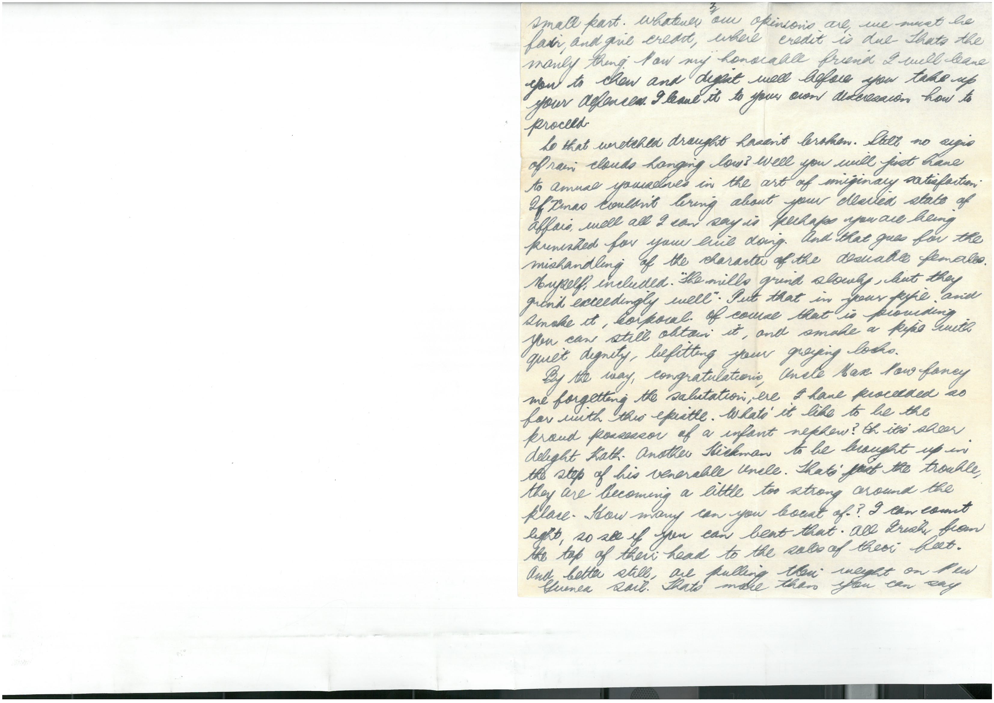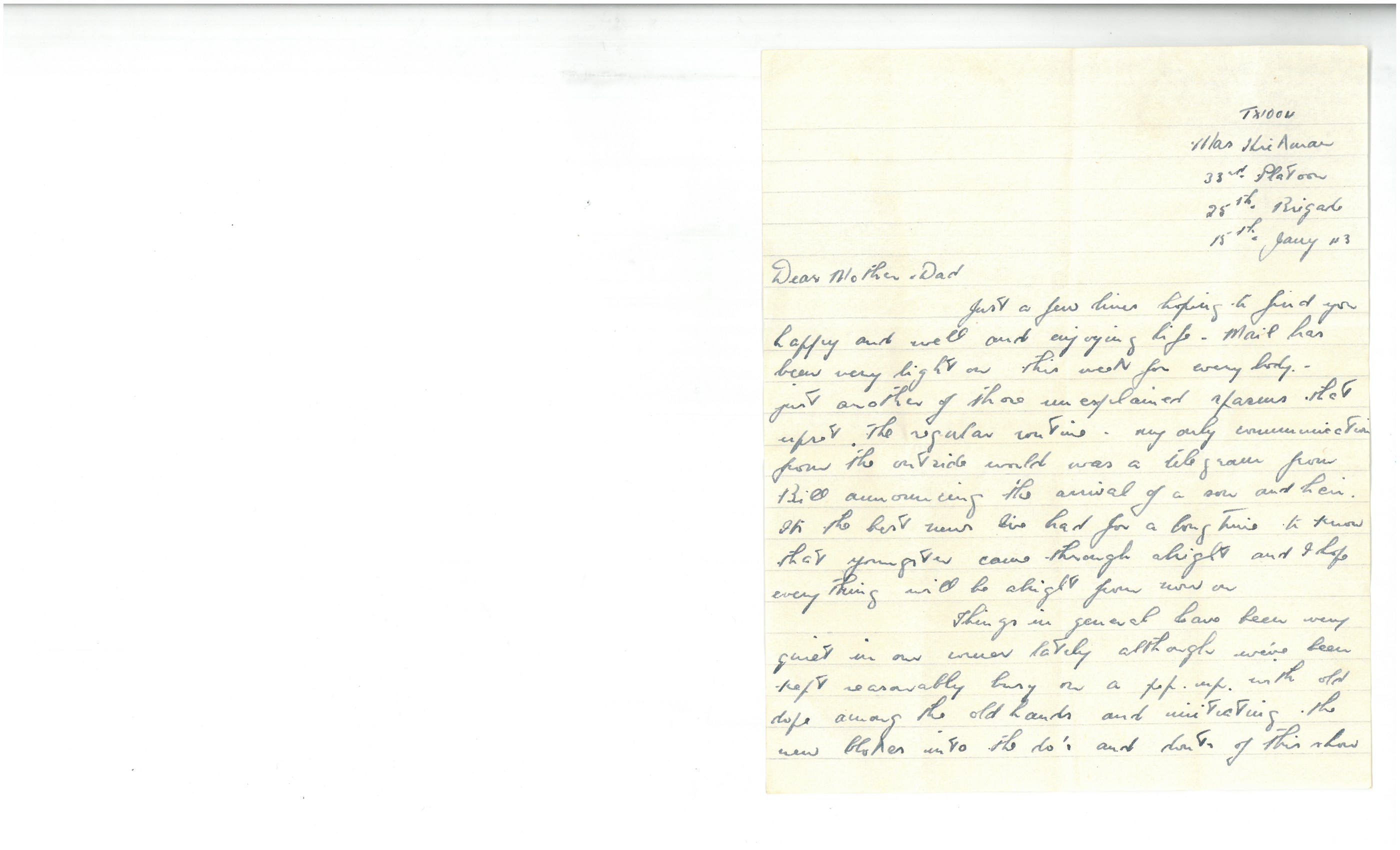 Just a few lines hoping to find you happy and well and enjoying life. Mail has been very light on this week for everybody – just another of those unexplained spasms that upset the regular routine. My only communication from the outside world was a telegram from Bill announcing then arrival of a son and heir. It’s the best news I’ve had for a long time to know that youngster came through alright and I hope everything will be alright from now on.